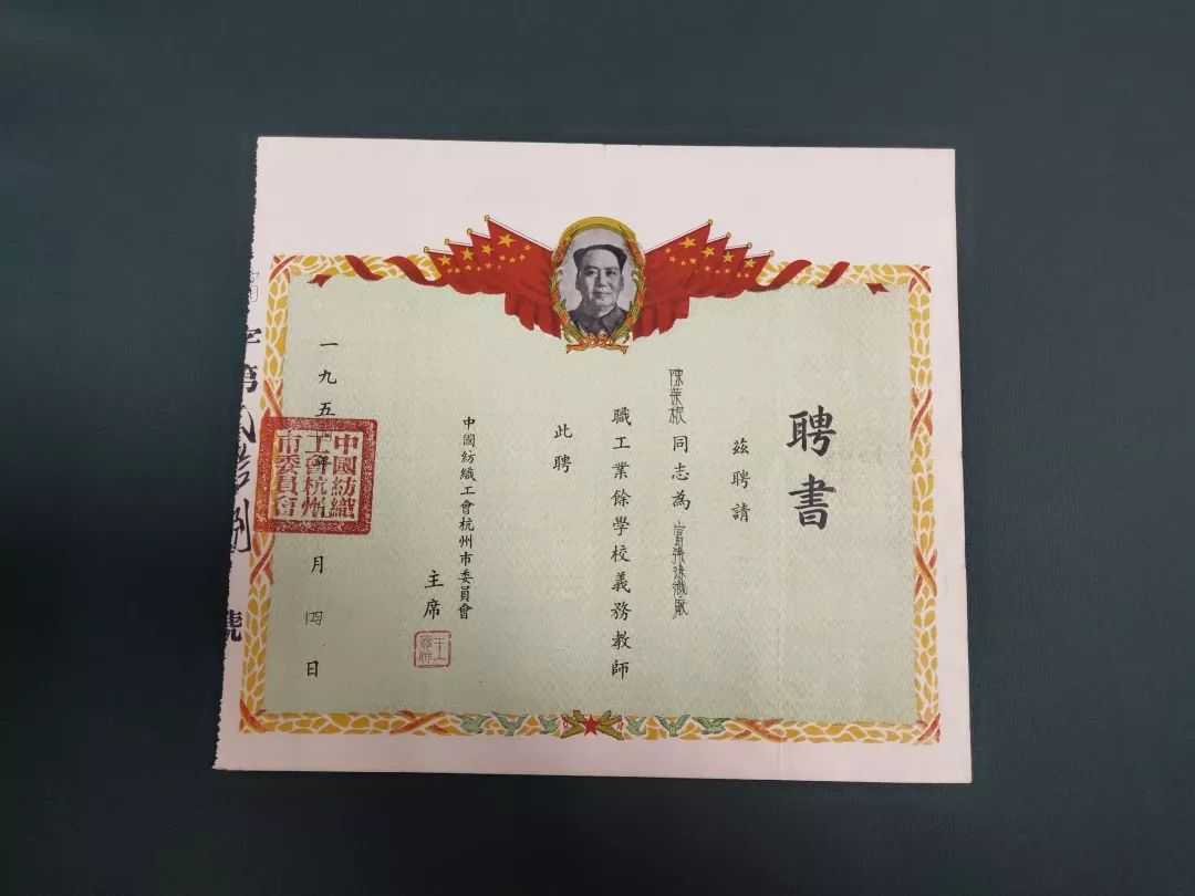 1954年中国纺织工会杭州市委员会教师聘书