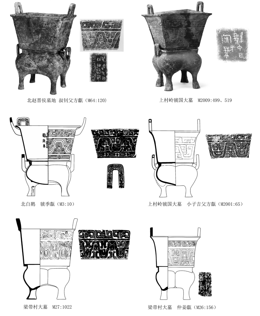 首先看方壶。上村岭M2001出土青铜器时代一致。出土方壶一对(M2001:90、92),方唇,颈长,微内曲,垂腹,平底,圈足较高;带盖,捉手部较高,颈部附一对龙首耳,长鼻前出,龙舌下衔一圆形扁体环。这类壶也有明确的演变序列。相比之下,M2001的两件方壶形态与上村岭M2012:25、北赵晋侯墓地M64:103最相似,比扶齐家方壶略晚,但比北赵晋侯墓方壶M93:31及同组的M102:22略早(M93组方壶腹部内收的位置更低),也明显早于梁带村大墓出土的方壶M27:1001。其中晋侯墓葬M93:31有铭文,器主为叔家父,即《史记·晋世家》的殇叔。他为晋穆侯之弟,代穆侯自立,穆侯的太子仇出奔。四年后,太子仇袭杀殇叔,即位为文侯。叔家父死于西周(公元前781年),壶的制作当在此之前,即为宣王时。