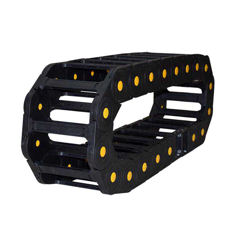 (3)单元链节由左右链板和上下盖板组成。拖链可以在每个部分打开。组装和拆卸都很方便。没有必要穿线。打开盖板后,电缆管道气管水管可以放入拖链。。