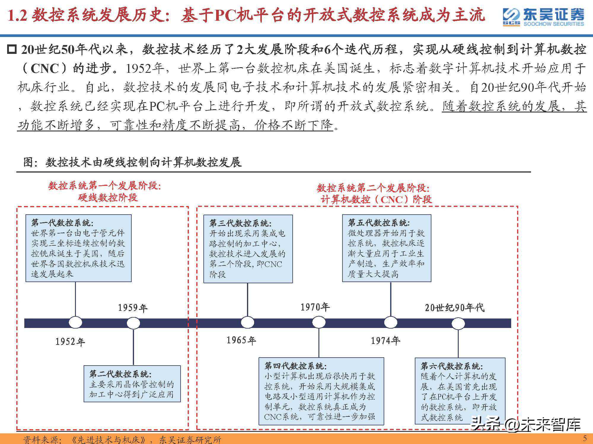 20世纪50年代以来,数控技术经历了2大发展阶段和6个迭代历程,实现从硬线控制到计算机数控(CNC)的进步。1952年,世界上第一台数控机床在美国诞生,标志着数字计算机技术开始应用于机床行业。自此,数控技术的发展同电子技术和计算机技术的发展紧密相关。自20世纪90年代开始,数控系统已经实现在PC机平台上进行开发,即所谓的开放式数控系统。随着数控系统的发展,其功能不断增多,可靠性和精度不断提高,价格不断下降。