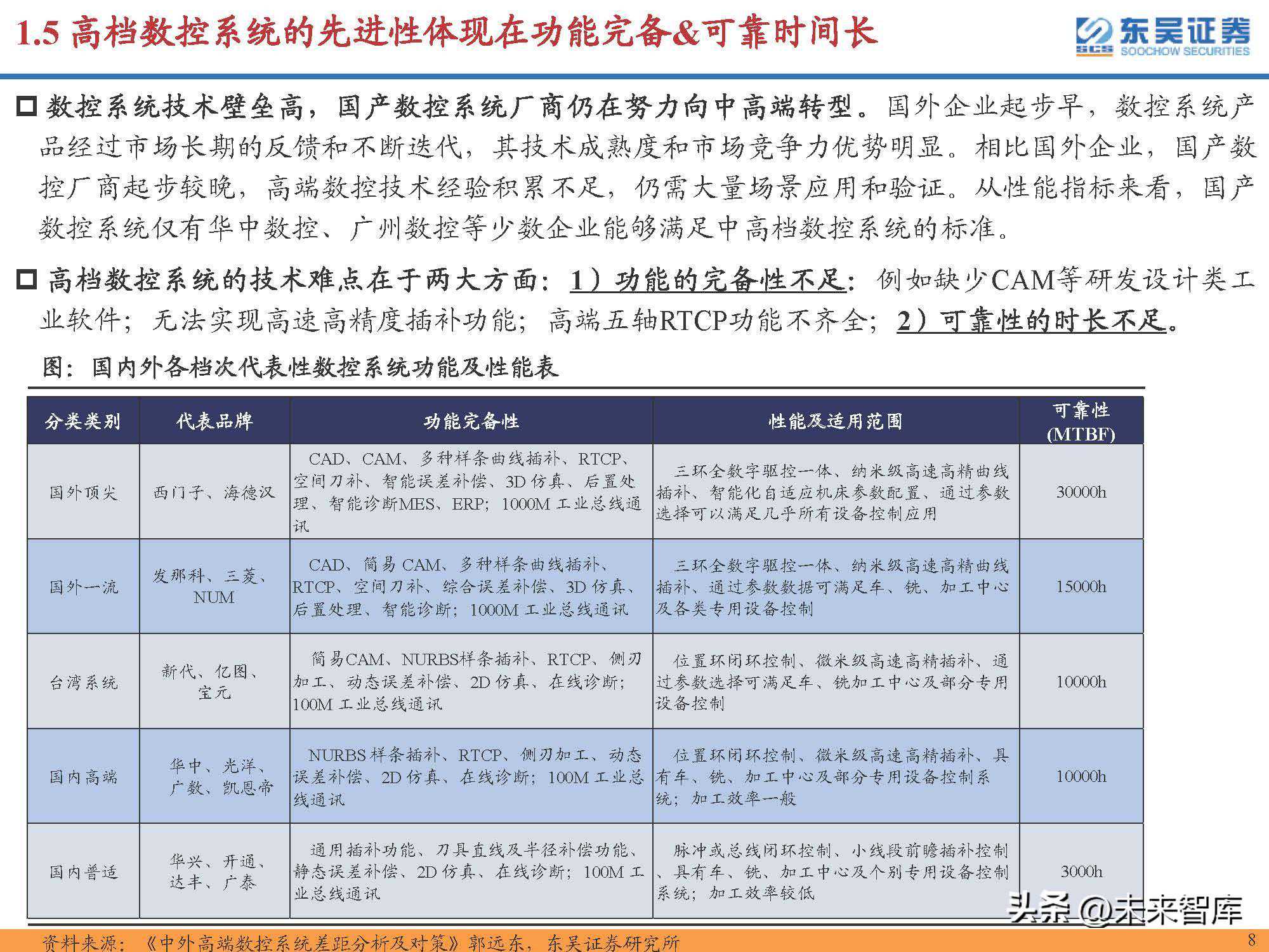国外高档数控系统的平均无故障运行时间可达30000小时,而国内的一般在10000小时左右,可靠性时长差距较为明显。主要原因系:1)国内数控系统硬件寿命较短:国内数控系统主要与中低端机床配套,加工环境较为恶劣,硬件质保通常为3年,而国外系统硬件寿命长达10年。2)国内数控系统软件的容错率和智能化水平较低:国内系统软件兼容性差,不足以应对多样的工作现场。此外国外系统能够实现智能化误差补偿,弥补机床随着年限增加精度降低的情况,进而提高了数控系统的使用年限。3)国内远程故障诊断水平落后:国外高端系统具备远程故障诊断能力,能够提前预判机床故障,显著增加配套机床的无故障运行时间,提高了数控系统的使用寿命。