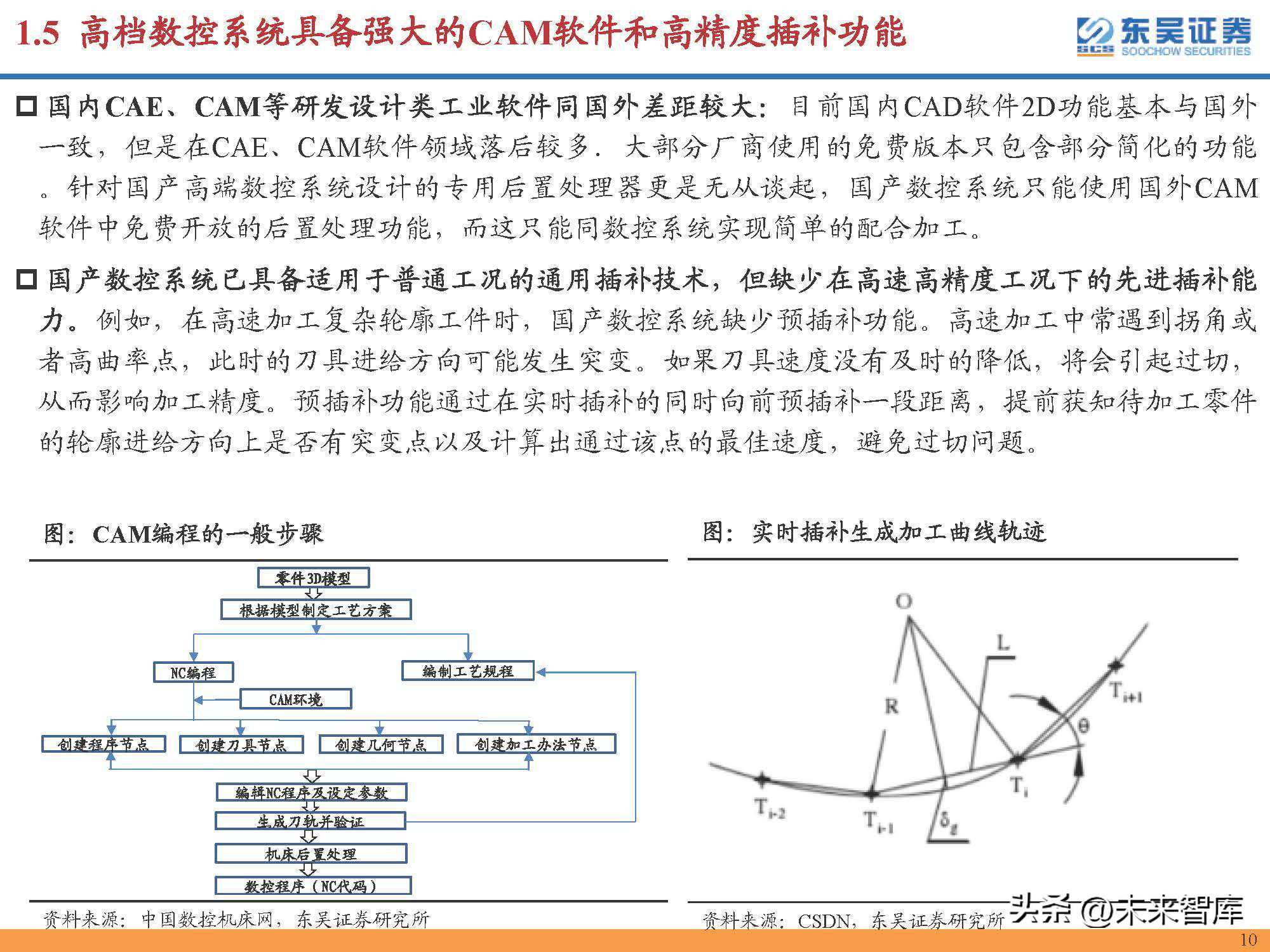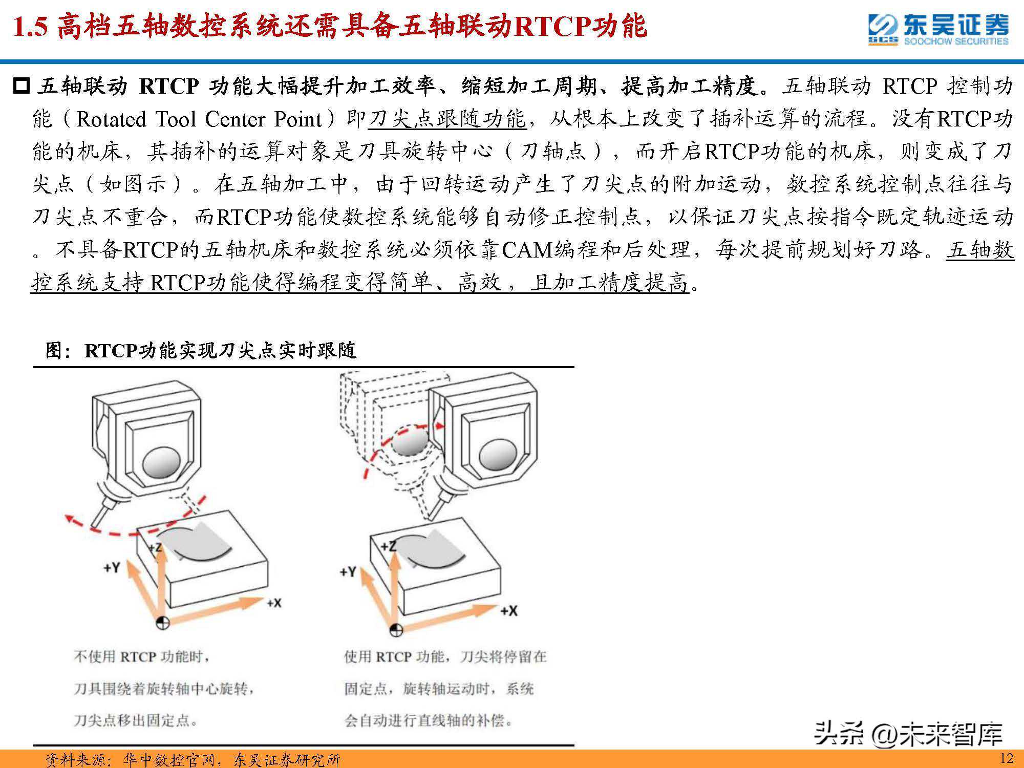 高档数控系统的技术难点在于两大方面:1)功能的完备性不足:例如缺少CAM等研发设计类工业软件;无法实现高速高精度插补功能;高端五轴RTCP功能不齐全;2)可靠性的时长不足。