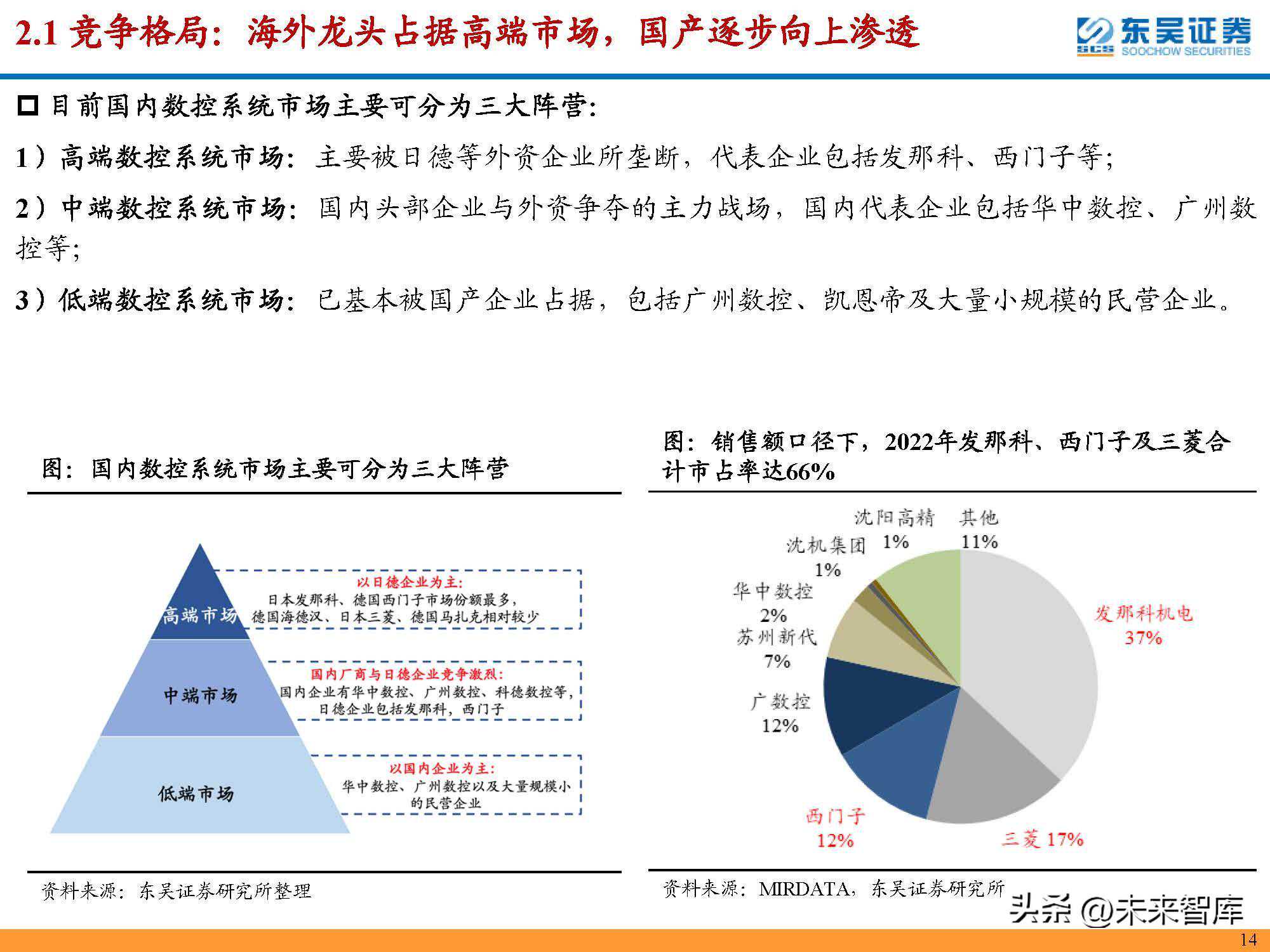 目前国内数控系统市场主要可分为三大阵营:1)高端数控系统市场:主要被日德等外资企业所垄断,代表企业包括发那科、西门子等;2)中端数控系统市场:国内头部企业与外资争夺的主力战场,国内代表企业包括华中数控、广州数控等;3)低端数控系统市场:已基本被国产企业占据,包括广州数控、凯恩帝及大量小规模的民营企业。