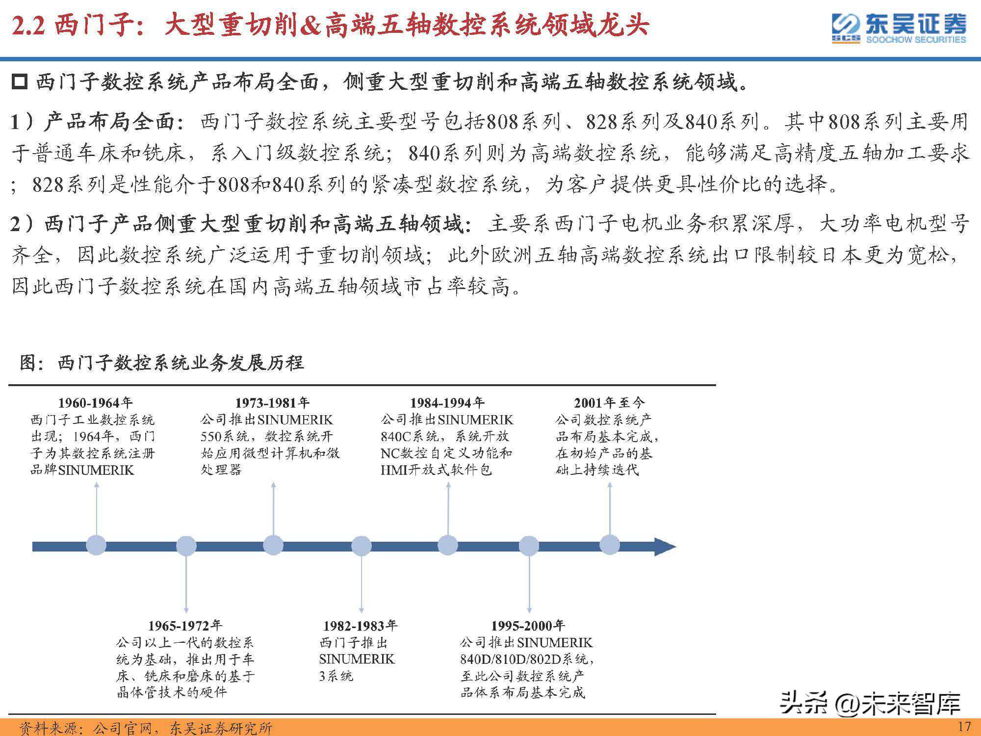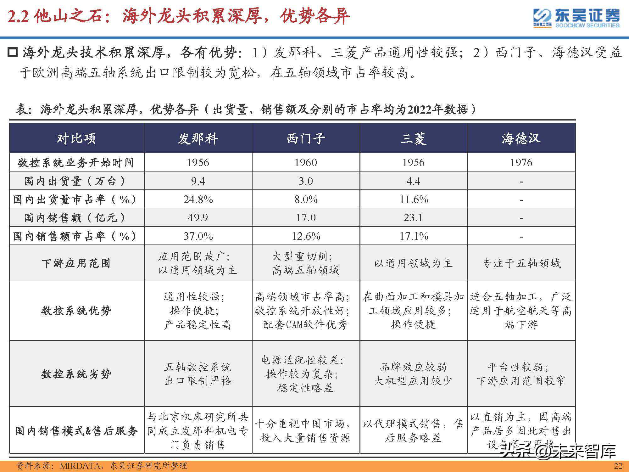 西门子数控系统产品布局全面,侧重大型重切削和高端五轴数控系统领域。1)产品布局全面:西门子数控系统主要型号包括808系列、828系列及840系列。其中808系列主要用于普通车床和铣床,系入门级数控系统;840系列则为高端数控系统,能够满足高精度五轴加工要求;828系列是性能介于808和840系列的紧凑型数控系统,为客户提供更具性价比的选择。2)西门子产品侧重大型重切削和高端五轴领域:主要系西门子电机业务积累深厚,大功率电机型号齐全,因此数控系统广泛运用于重切削领域;此外欧洲五轴高端数控系统出口限制较日本更为宽松,因此西门子数控系统在国内高端五轴领域市占率较高。