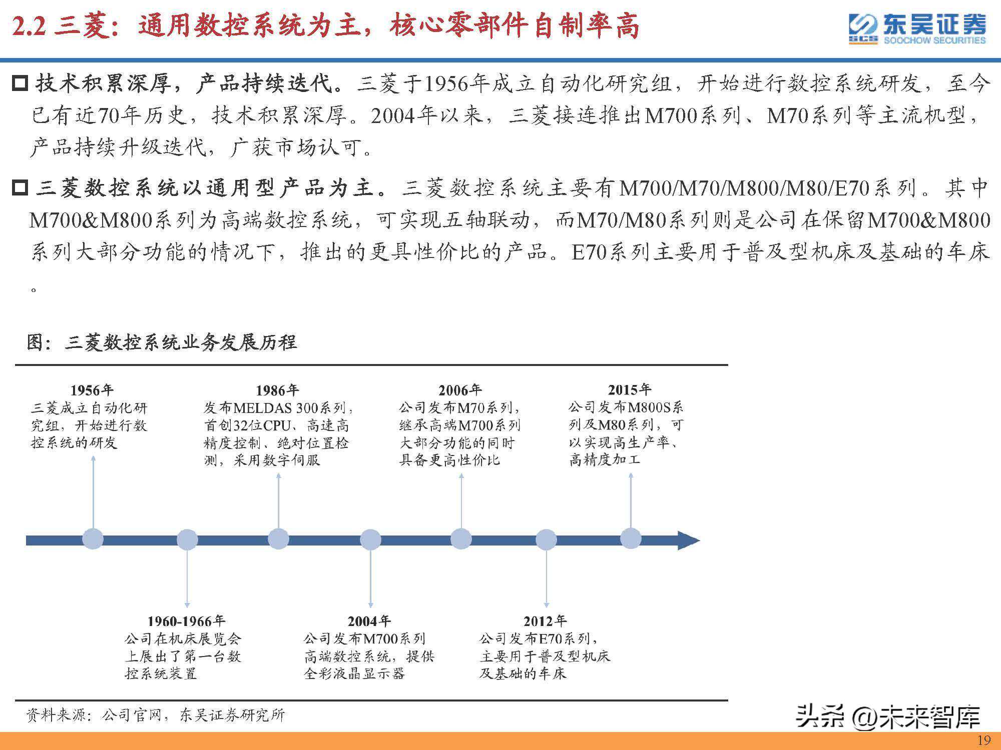 技术积累深厚,产品持续迭代。三菱于1956年成立自动化研究组,开始进行数控系统研发,至今已有近70年历史,技术积累深厚。2004年以来,三菱接连推出M700系列、M70系列等主流机型,产品持续升级迭代,广获市场认可。三菱数控系统以通用型产品为主。三菱数控系统主要有M700/M70/M800/M80/E70系列。其中M700M800系列为高端数控系统,可实现五轴联动,而M70/M80系列则是公司在保留M700M800系列大部分功能的情况下,推出的更具性价比的产品。E70系列主要用于普及型机床及基础的车床。