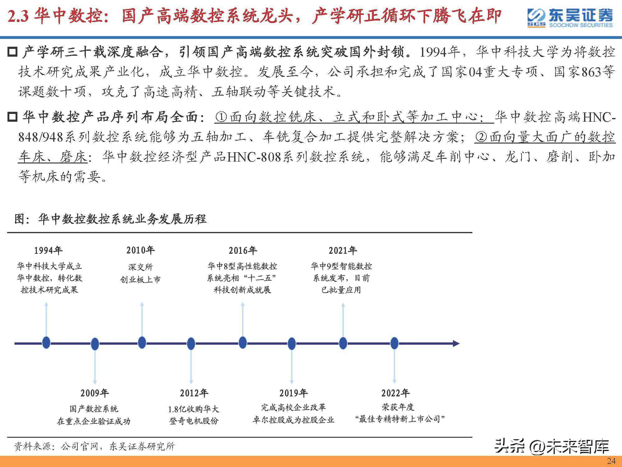 产学研三十载深度融合,引领国产高端数控系统突破国外封锁。1994年,华中科技大学为将数控技术研究成果产业化,成立华中数控。发展至今,公司承担和完成了国家04重大专项、国家863等课题数十项,攻克了高速高精、五轴联动等关键技术。华中数控产品序列布局全面:①面向数控铣床、立式和卧式等加工中心:华中数控高端HNC848/948系列数控系统能够为五轴加工、车铣复合加工提供完整解决方案;②面向量大面广的数控车床、磨床:华中数控经济型产品HNC-808系列数控系统,能够满足车削中心、龙门、磨削、卧加等机床的需要。