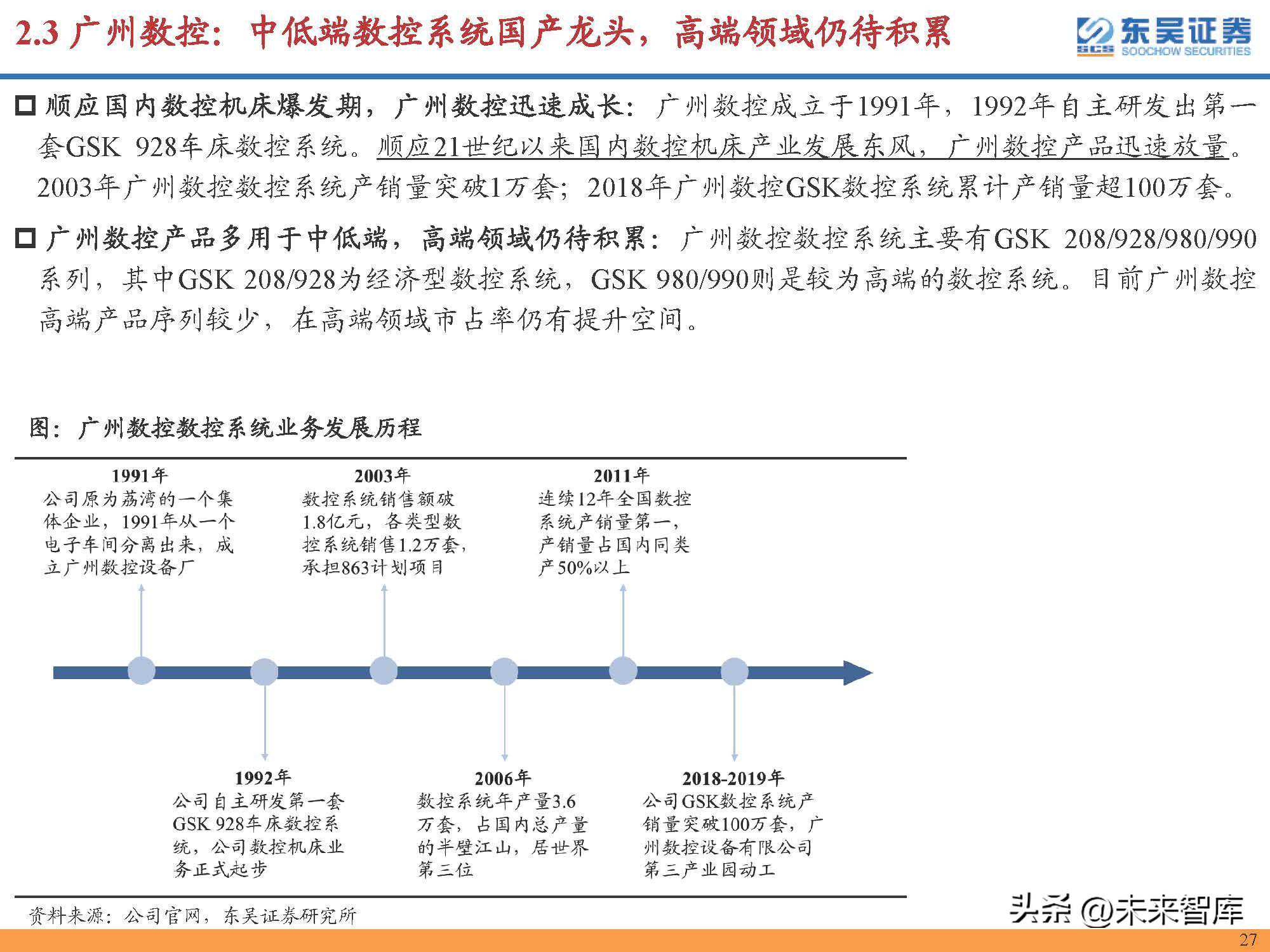 顺应国内数控机床爆发期,广州数控迅速成长:广州数控成立于1991年,1992年自主研发出第一套GSK928车床数控系统。顺应21世纪以来国内数控机床产业发展东风,广州数控产品迅速放量。2003年广州数控数控系统产销量突破1万套;2018年广州数控GSK数控系统累计产销量超100万套。广州数控产品多用于中低端,高端领域仍待积累:广州数控数控系统主要有GSK208/928/980/990系列,其中GSK208/928为经济型数控系统,GSK980/990则是较为高端的数控系统。目前广州数控高端产品序列较少,在高端领域市占率仍有提升空间。