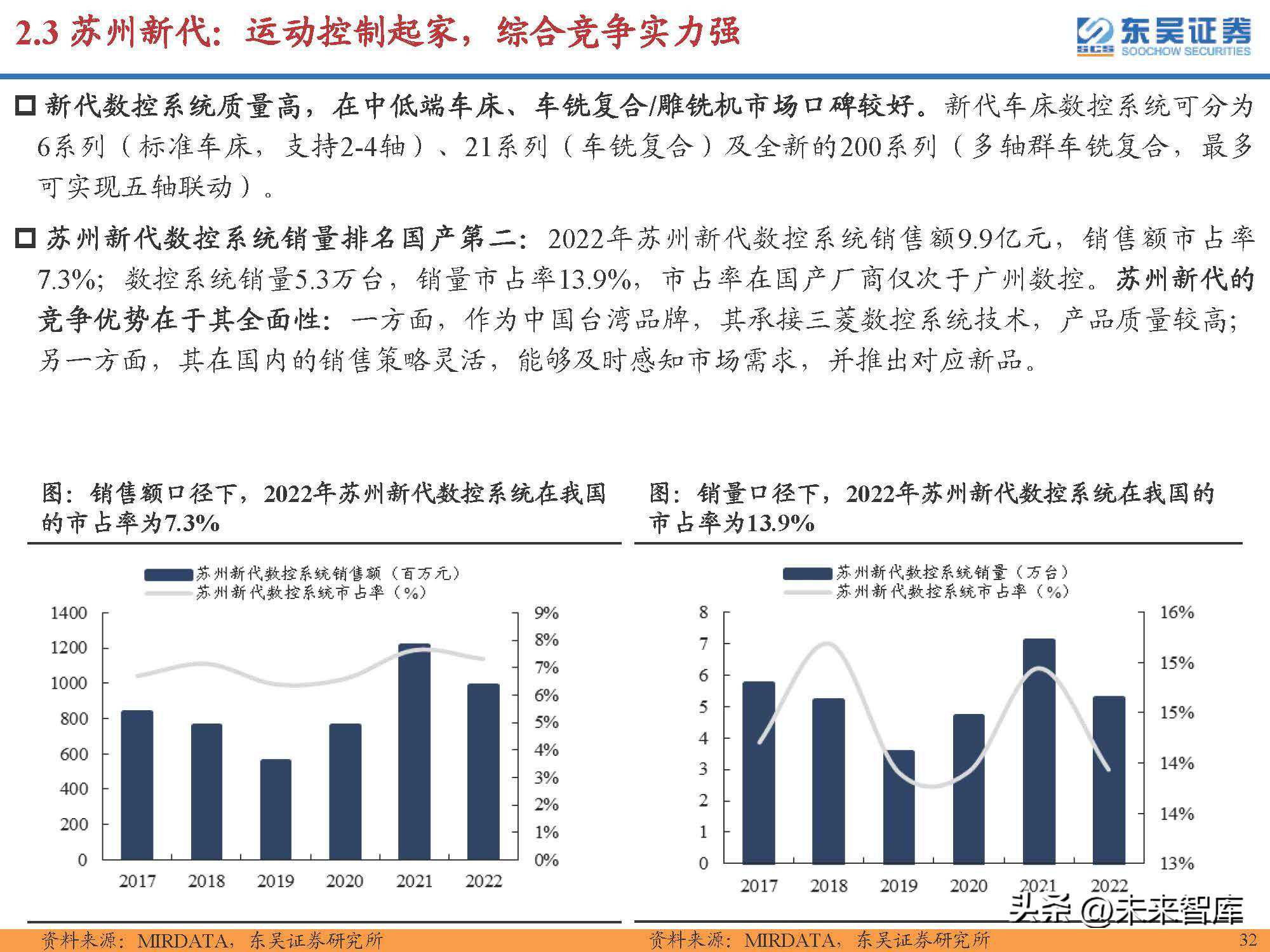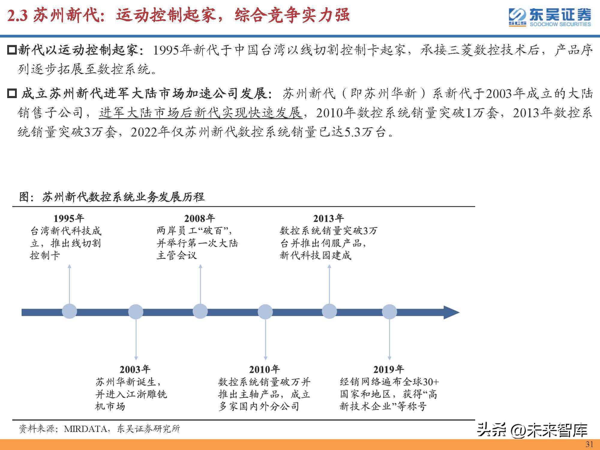 新代以运动控制起家:1995年新代于中国台湾以线切割控制卡起家,承接三菱数控技术后,产品序列逐步拓展至数控系统。成立苏州新代进军大陆市场加速公司发展:苏州新代(即苏州华新)系新代于2003年成立的大陆销售子公司,进军大陆市场后新代实现快速发展,2010年数控系统销量突破1万套,2013年数控系统销量突破3万套,2022年仅苏州新代数控系统销量已达5.3万台。
