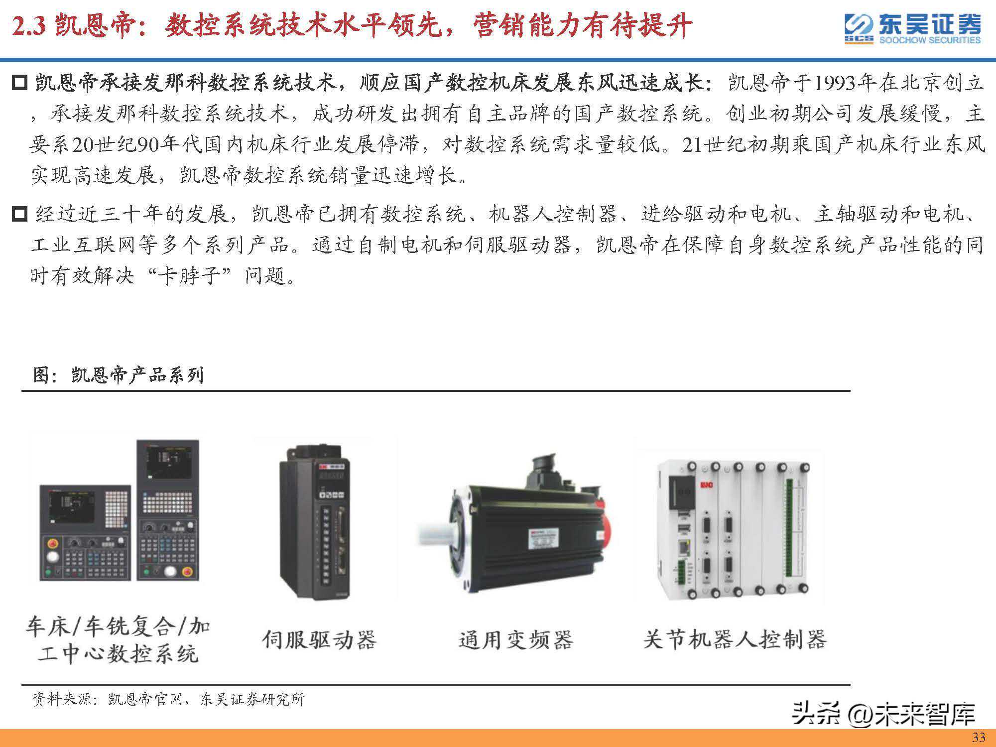 凯恩帝承接发那科数控系统技术,顺应国产数控机床发展东风迅速成长:凯恩帝于1993年在北京创立,承接发那科数控系统技术,成功研发出拥有自主品牌的国产数控系统。创业初期公司发展缓慢,主要系20世纪90年代国内机床行业发展停滞,对数控系统需求量较低。21世纪初期乘国产机床行业东风实现高速发展,凯恩帝数控系统销量迅速增长。经过近三十年的发展,凯恩帝已拥有数控系统、机器人控制器、进给驱动和电机、主轴驱动和电机、工业互联网等多个系列产品。通过自制电机和伺服驱动器,凯恩帝在保障自身数控系统产品性能的同时有效解决“卡脖子”问题。