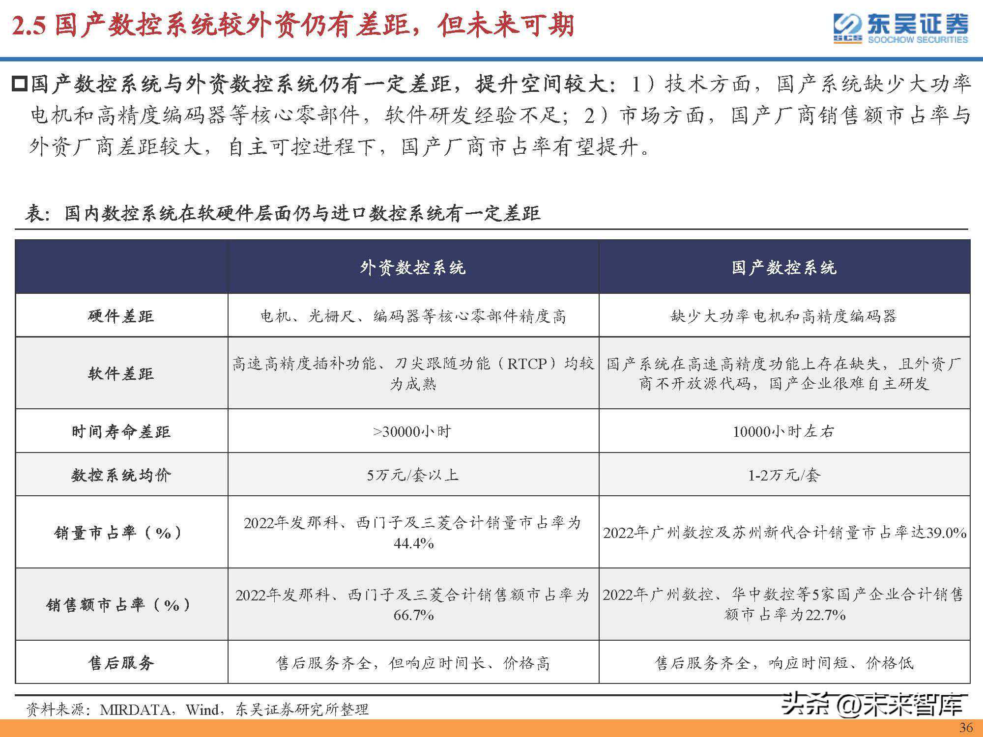 国产数控系统与外资数控系统仍有一定差距,提升空间较大:1)技术方面,国产系统缺少大功率电机和高精度编码器等核心零部件,软件研发经验不足;2)市场方面,国产厂商销售额市占率与外资厂商差距较大,自主可控进程下,国产厂商市占率有望提升。