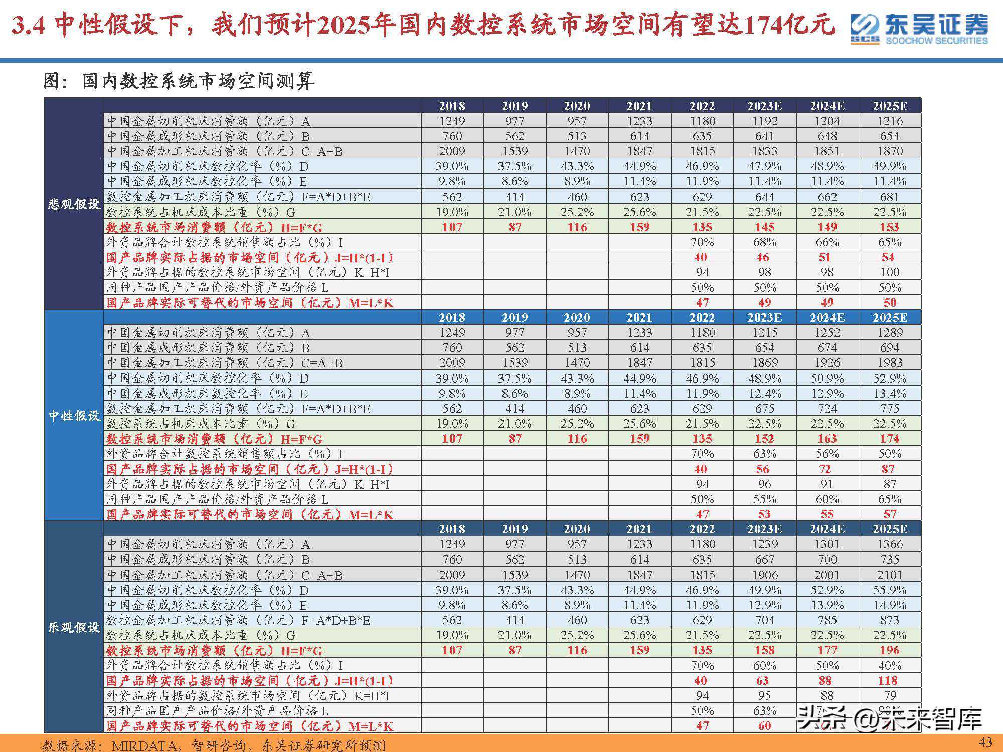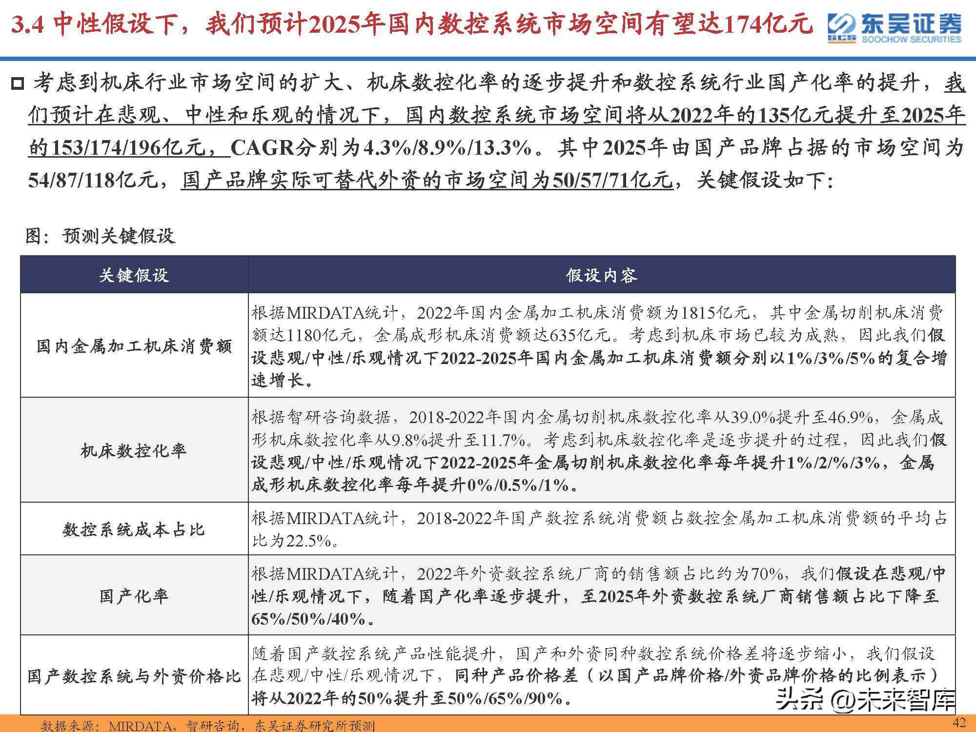 根据我们测算,全球数控系统市场空间超500亿元:根据德国机床制造商协会数据,2021年全球主要机床生产规模为709.4亿欧元。假设按照全球机床综合数控化率为60%,数控系统占机床成本比例20%,欧元兑人民币汇率1:7.5测算,全球数控系统市场空间约为638.5亿人民币。