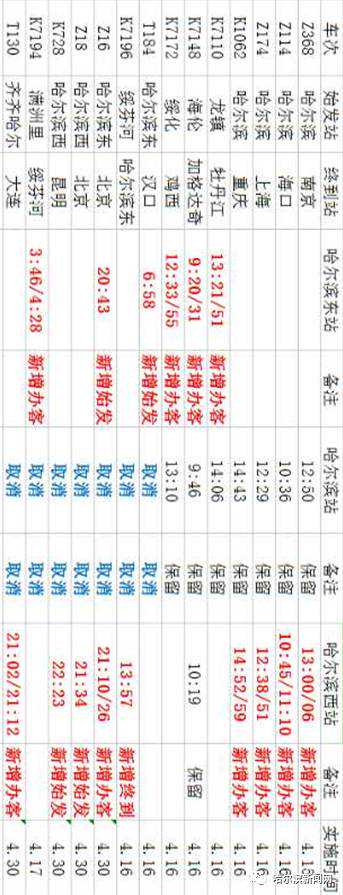4.自4月30日起,哈尔滨—北京Z16次调整为哈尔滨东站始发。取消哈尔滨站,增加哈尔滨东站、哈尔滨西站办理客运业务。哈尔滨东站20:43开,哈尔滨西站21:10到、21:26开。