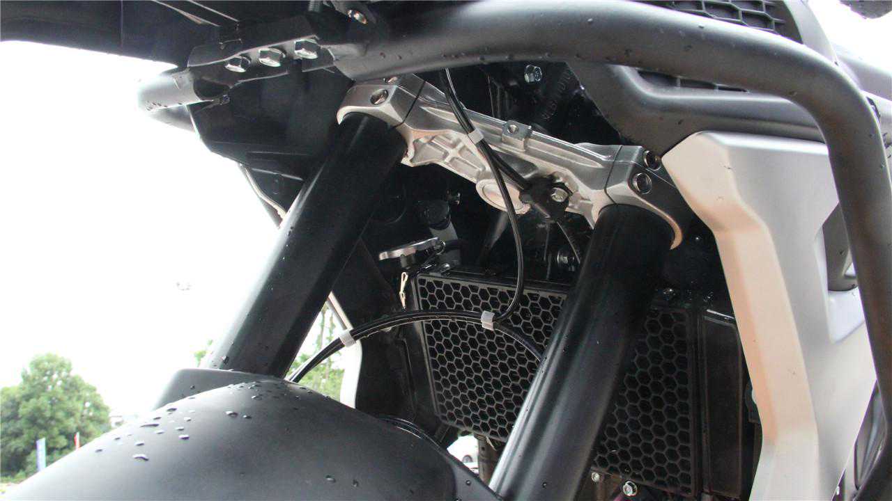 在非铺装路面下,车辆整体感受很扎实,而且能感觉到很高的极限,这在普通街车上是无法体会到的。由于前轮为19寸轮胎,车辆在沙石路面的导向性很强,这也是17寸轮胎不能提供的。