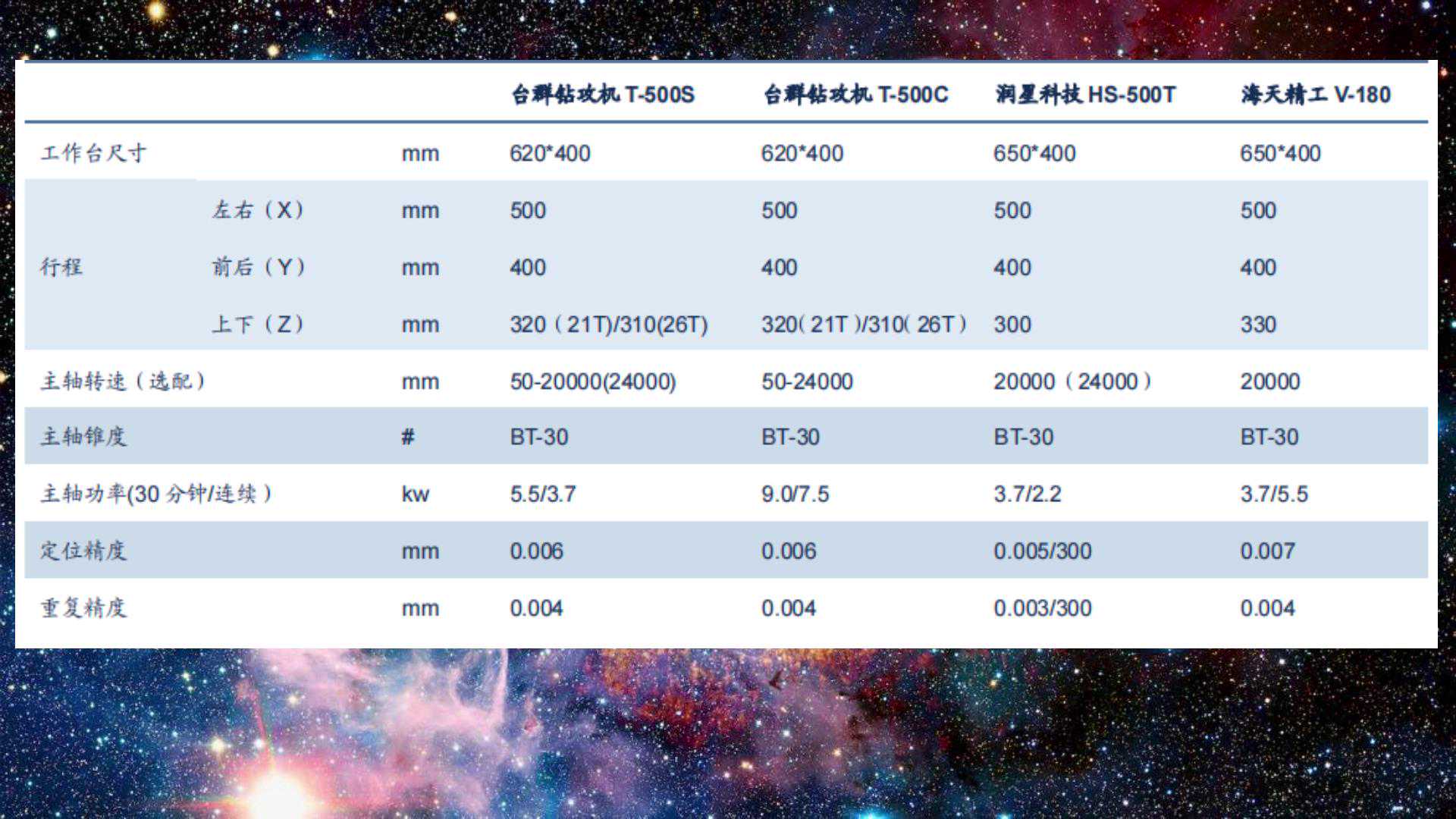 我们再比较一下国内竞争对手的情况,我们就拿海天精工的V-180,润星科技的HS-500T,和台群T-500C、台群T-500S,做一下比较。从图表可以看出来,创世纪、海天精工、润星科技的钻攻中心,在精度、重复定位精度等指标上,没什么差距,在主轴功率上,台群完全占优,加工稳定性更强,效率更高。