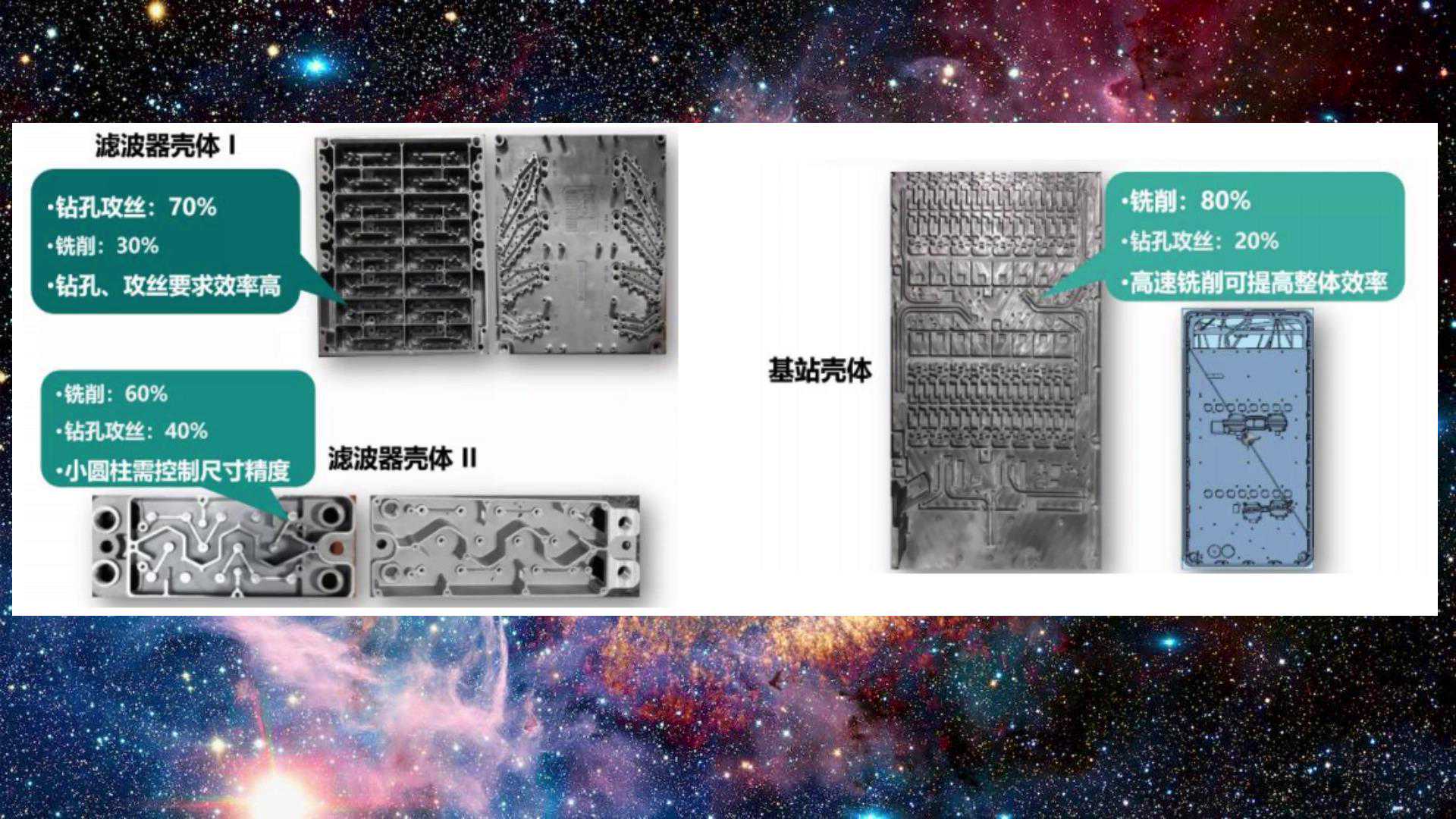 我们的5G基站滤波器,需要使用钻攻机进行钻孔、攻牙和铣削加工,对表面公差、光洁度,加工效率都要求非常高。滤波器的孔位非常多,有的孔位甚至高达300多个。钻孔与攻丝,需要在多个面经过多道工序的加工,重复装拆频率非常高,占整个加工时间的2/3,而且钻头和丝锥非常容易断,所以钻攻机的生产效率,对整体加工效率影响极大。