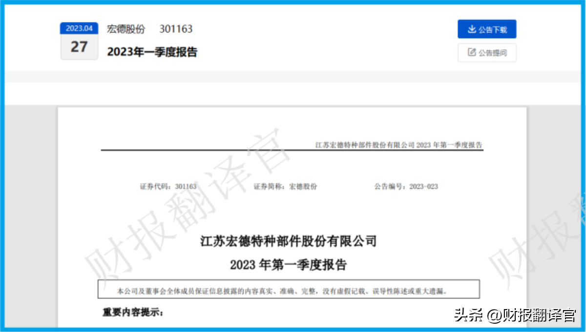 大家好我是财报翻译官,今天将调研A股机器人概念板块中,宏德股份(股票代码:301163)这家上市企业2023年第一季度财报,下面进入今天的主题。