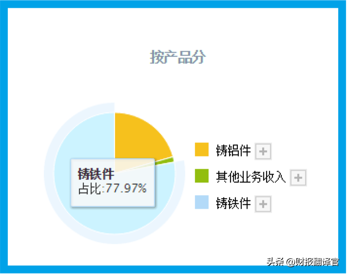 这家公司铸铁件的收入占比为77.97%,铸铝件的收入占比为20.6%。