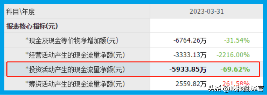 2023年第一季度,这家公司因投资活动而产生的现金流量净额为-5,934万元,这说明该企业在扩产,而且投资的钱主要用在构建固定资产和其他投资上。