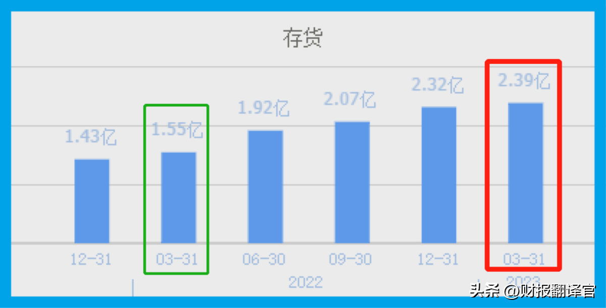 2022年第一季度,该公司的存货为1.55亿元。到了2023年第一季度,这家企业的存货就达到了2.39亿元,同比增长了54%。