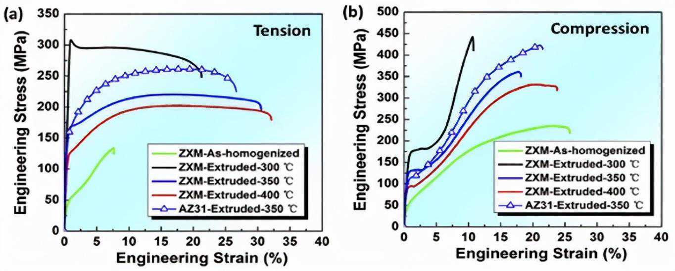 JIANGMG等利用挤压法制备了(简称ZXM)合金。挤压过程通过晶粒细化和织构改性,获得了良好的强度和塑性平衡。图1为均匀化和挤压态ZXM和AZ31合金的力学性能。可以看出,300℃下挤压的合金屈服强度为307MPa,伸长率为20.6%。在350℃挤压后,获得了几乎完全弥散的微观组织(DRX分数为0.96)和含有稀土织构成分的显著弱化的基底织构,从而获得高压缩/拉伸屈服比为0.8,伸长率为30.0%,屈服强度为164MPa。