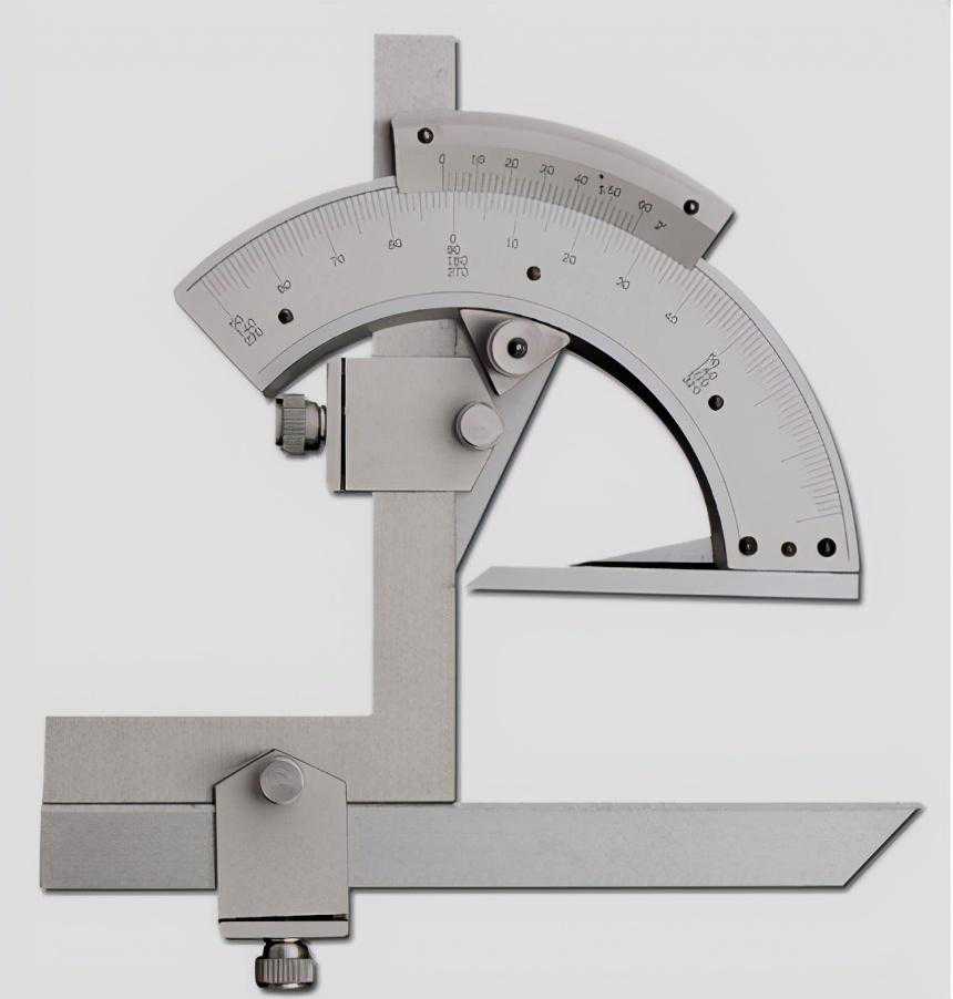 万能角度尺又被称为角度规、游标角度尺和万能量角器,它是利用游标读数原理来直接测量工件角度或进行划线的一种角度量具。万能角度尺适用于产品的内、外角度测量,可测0°~320°外角及40°~130°内角。图10为万能角尺。