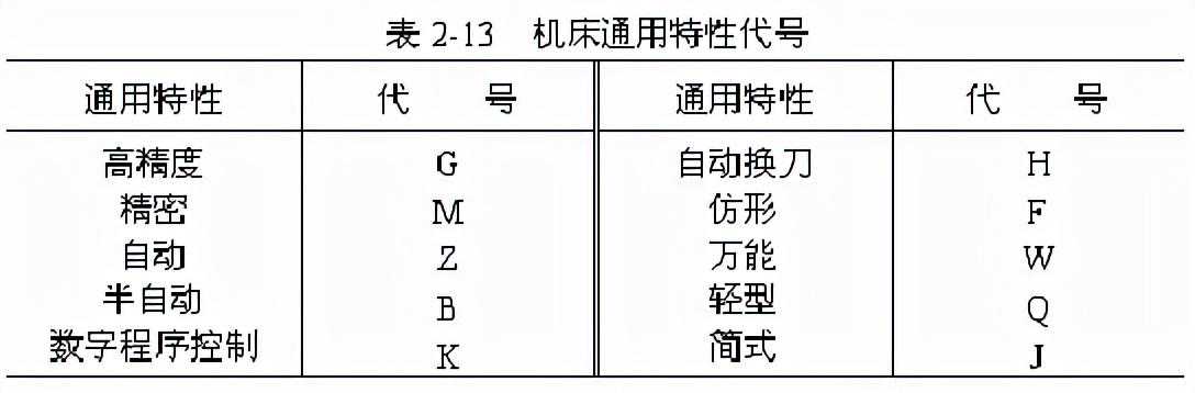 (2)机床的特性代号机床的特性代号,包括通用特性和结构特性,也用汉语拼音字母表示。当某类机床,除有普通型式外,还有如表2-13中所列的各种通用特性时,则应在类别代号之后加上相应的通用特性代号,如CM6132型号中"M"表示"精密"之意,是精密普通车床。