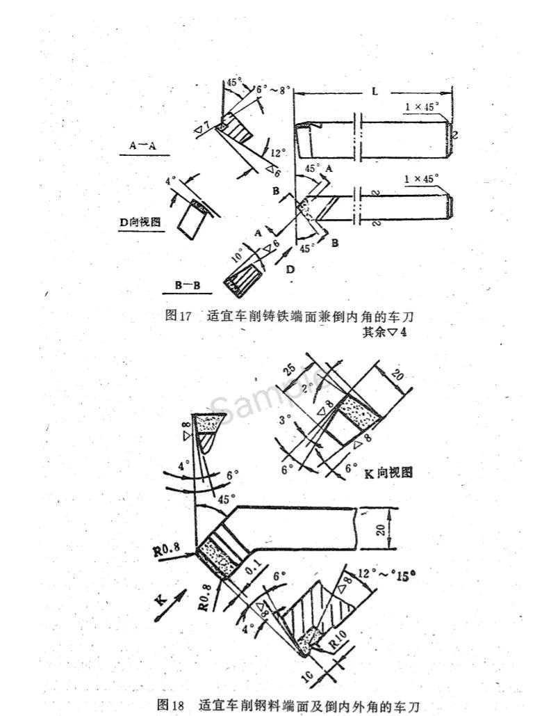 偏刀的前角、后角与外圆车刀基本相同。但它的主偏角常采用90或大于90°,副偏角一般选在10°~20°之间。