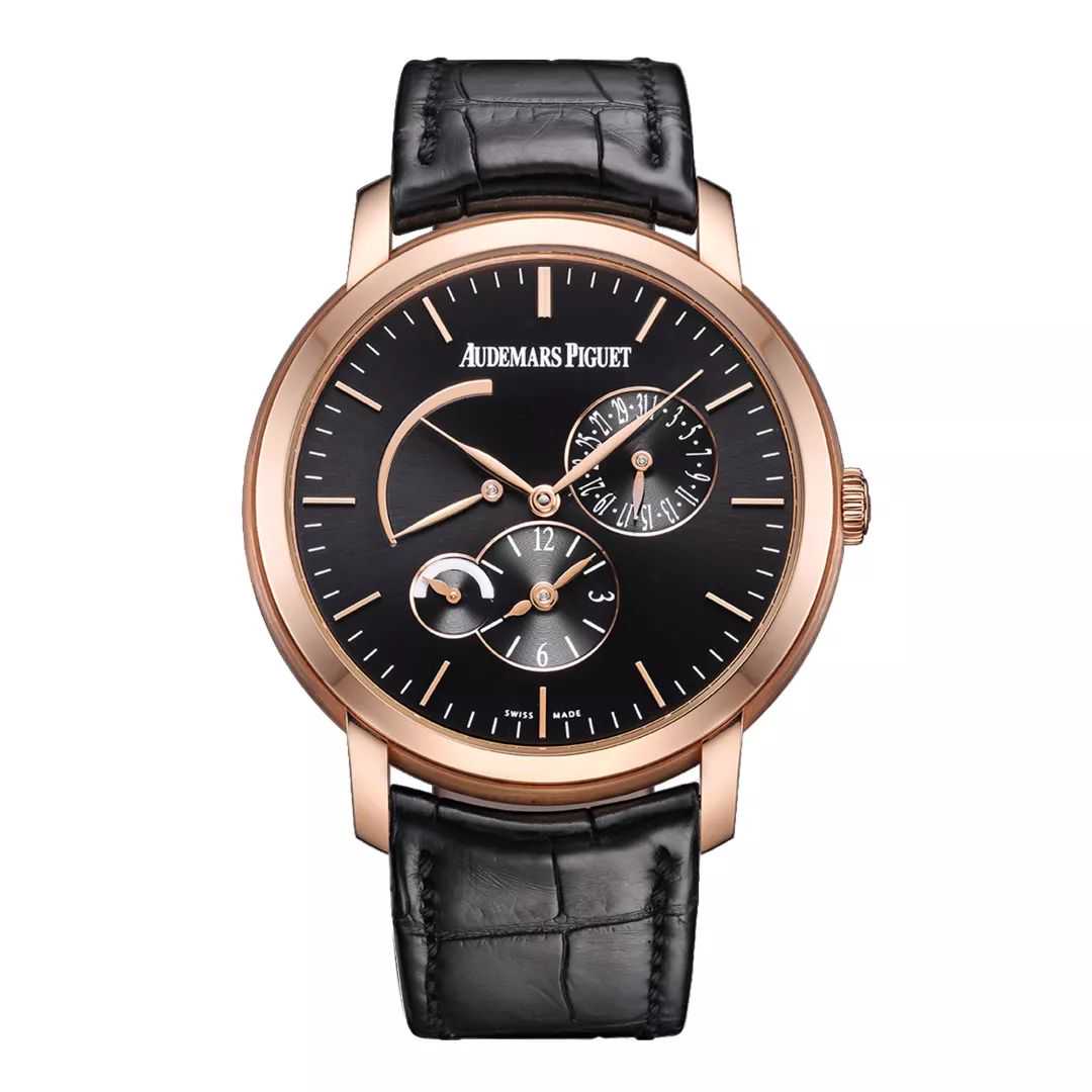 18K玫瑰金表壳和刻度、指针在黑色表盘衬托下,显示出低调奢华之感,黑色鳄鱼皮表带是保持佩戴感柔软与服帖的关键,与18K金针扣式表扣守护着手腕体面。