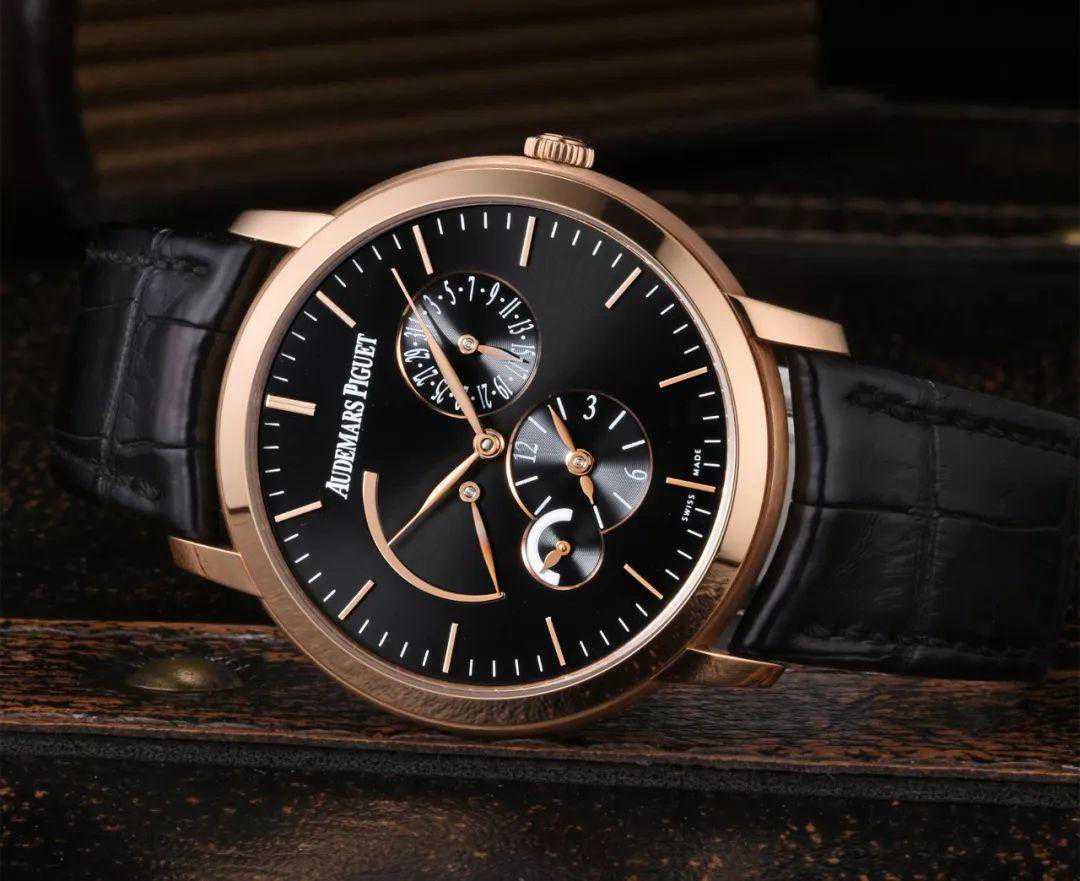 这款爱彼的黑金设计,从气场上就给人一种威严稳重之感。日期显示、两地时盘、动储、日夜显示的众多功能汇集的41mm直径表盘,也是发条鱼爱这款表的原因。