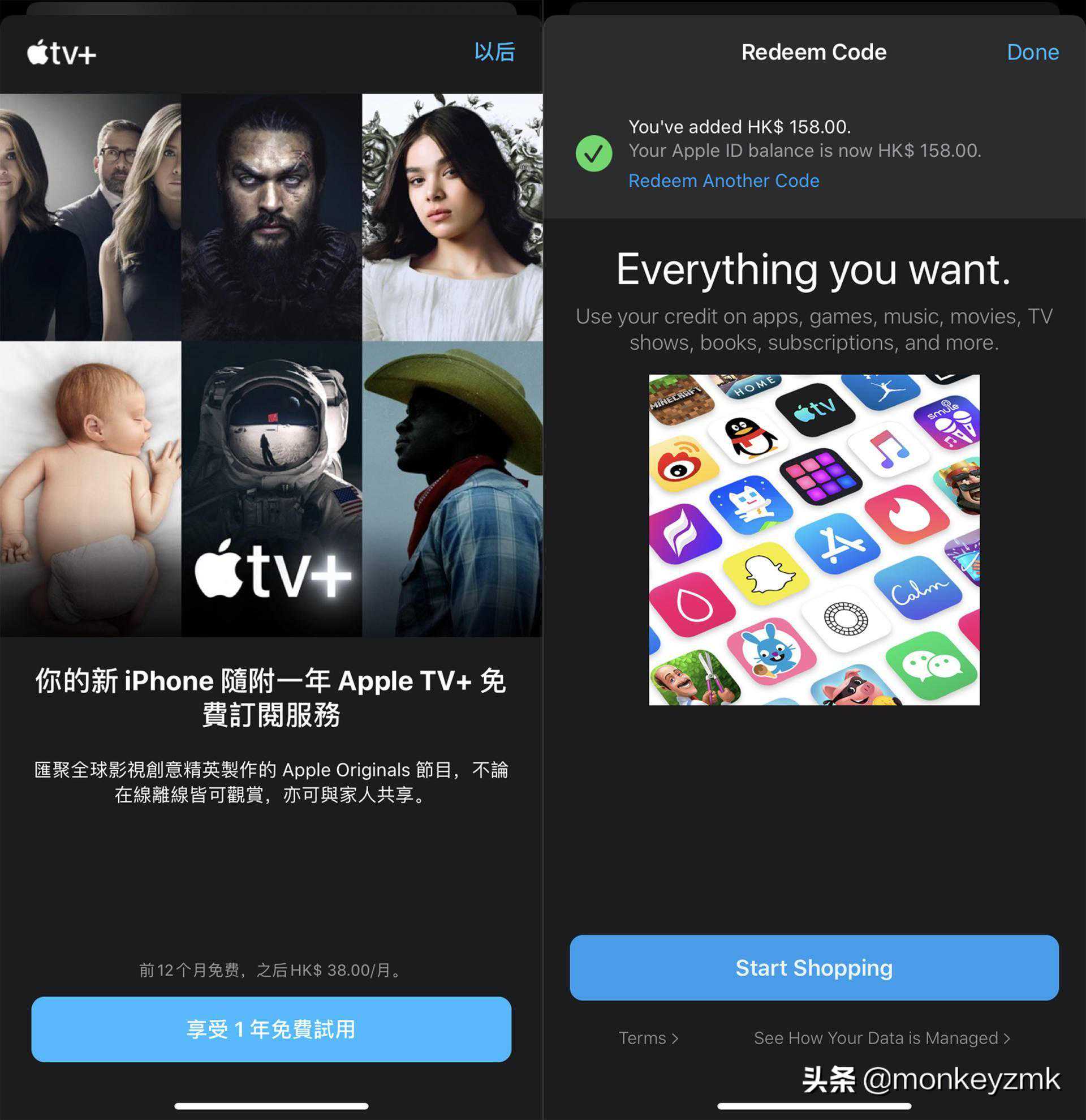 以上活动一切以实际情况为准,打开AppleTV查看自己是否可以获得一年的免费试用,如果不满足条件那么仅能享受到7天或者30天的免费试用。此外想要使用AppleTV+服务必须要绑定支付方式,不过香港的支付宝以及信用卡大概弄起来比较麻烦,这个时候我们只能通过苹果礼品卡充值,只要充值50港币即可。楼主淘宝上搜了一圈最低只有158港币面额的充值卡。