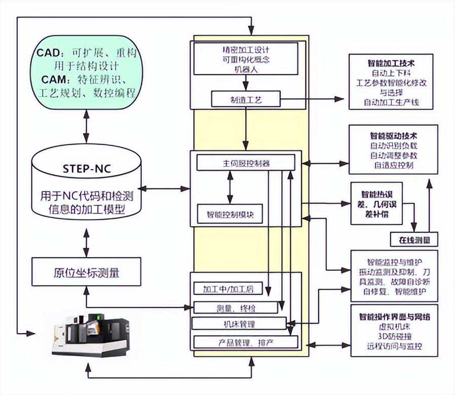 智能化数控系统关键技术研究在于数控系统的开放化、网络化;具有自适应、自学习的智能伺服系统;多传感器信息融合理论及技术;CAD、CAM、CNC集成技术等。