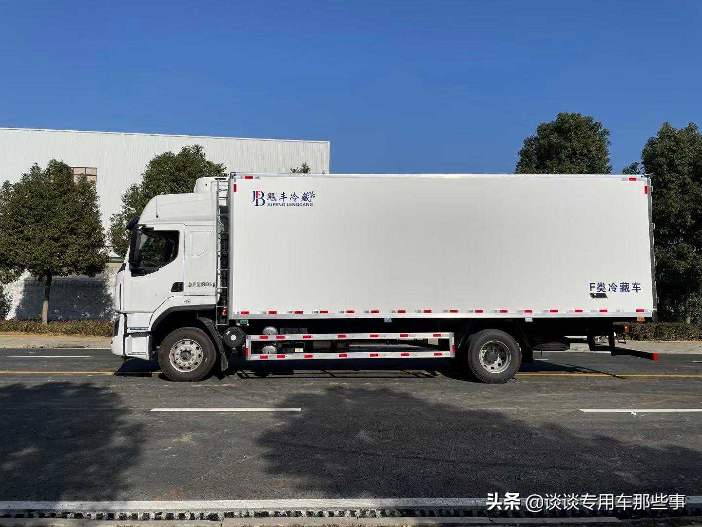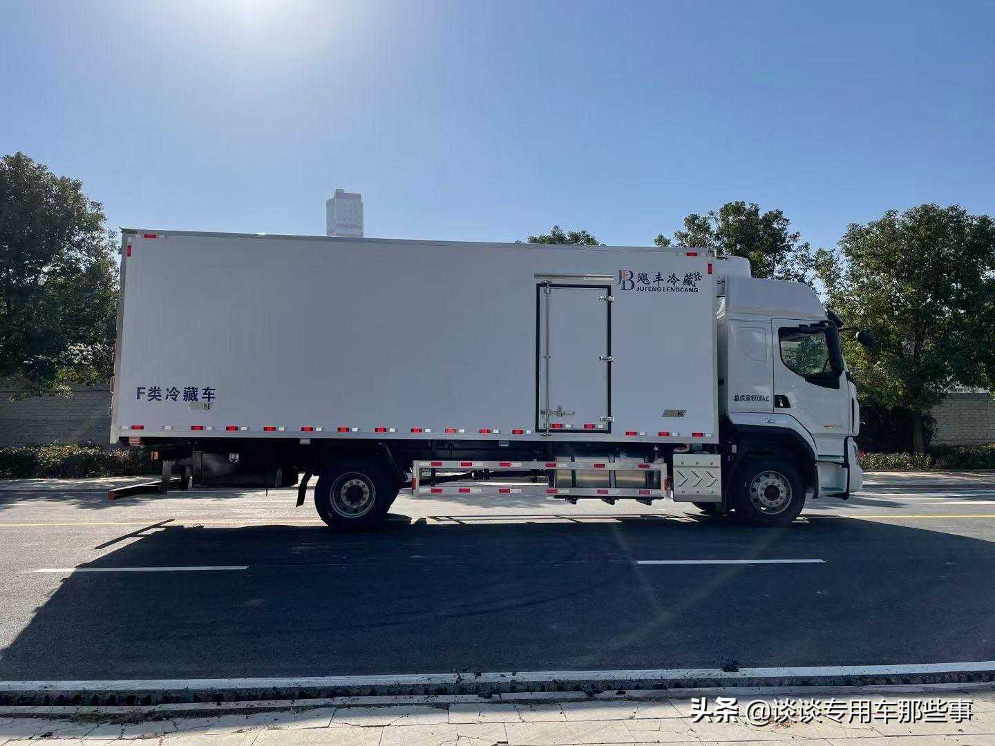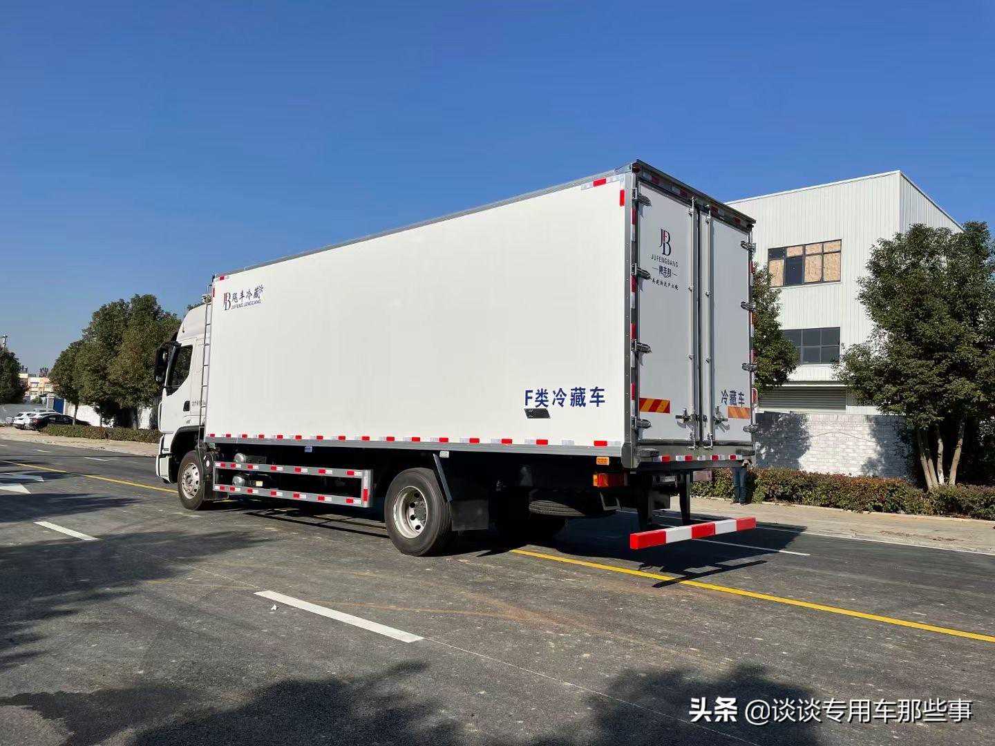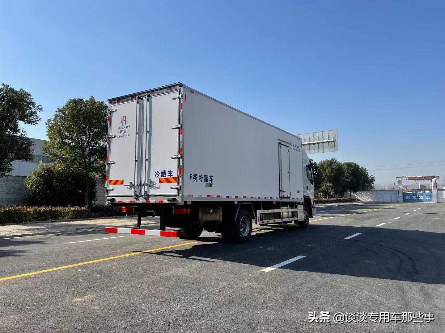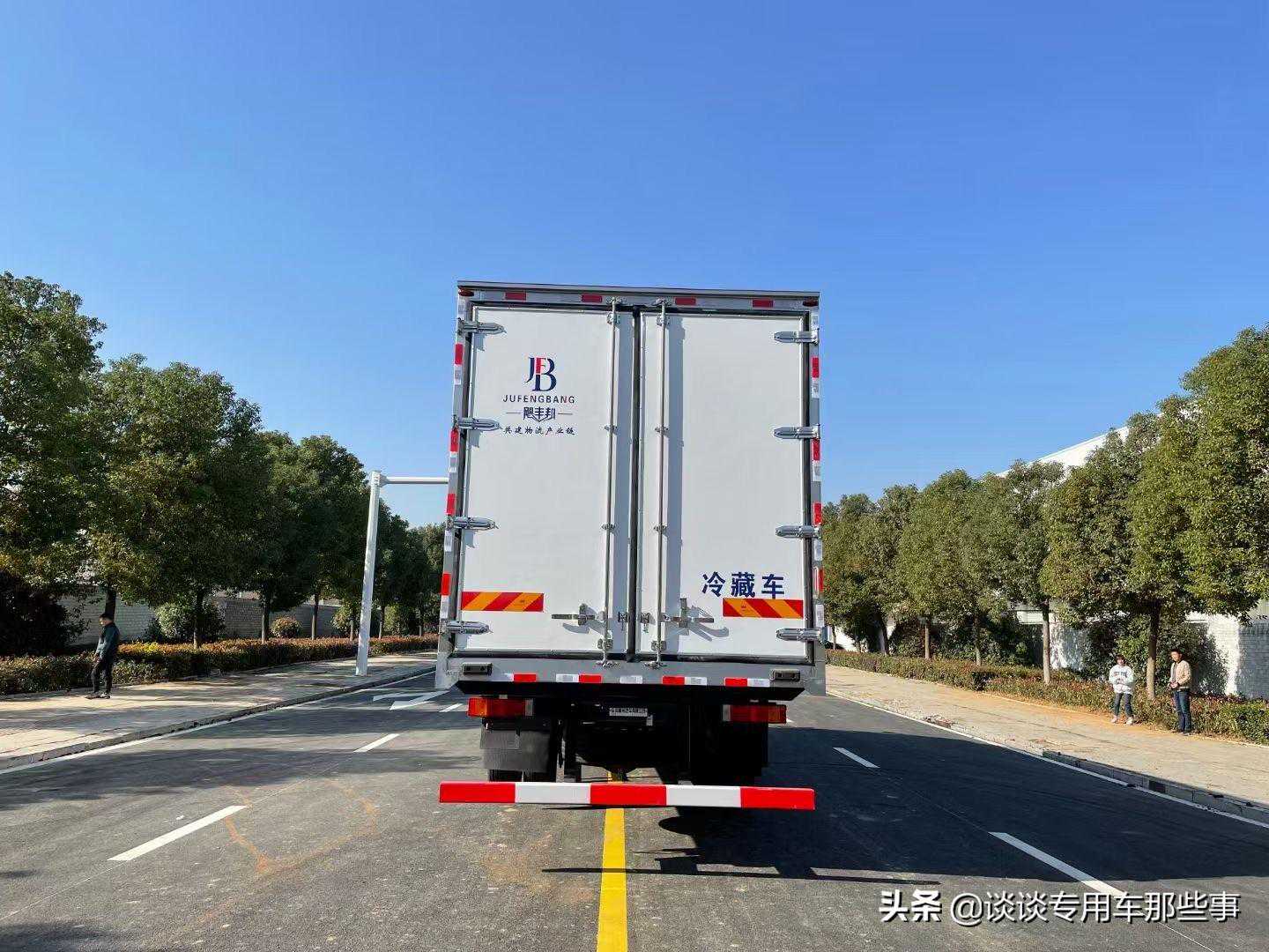 箱体《断桥隔温工艺、整体结构框架》;内外面料为3mm新款哑光玻璃钢;侧板+顶板:龙骨断桥为松木复合板;木质隔温结构;夹心为8公分厚专用保温材料;全密封双组合聚氨酯胶粘连;厢体厚度为8cm;镀锌包角;最新款铝合金包边型材;型材局部厚度为4mm(钢制铆钉加固);厢体内部采用2个LED照明灯及厢体示宽灯;后门框为2mm厚不锈钢材质;门框密封条为三元乙丙橡胶材质;加厚型不锈钢合页及锁件;副梁为Q700车用大梁钢;15mm厚大梁垫皮;加装防撞胶块;不锈钢门锁件,配后双开门。