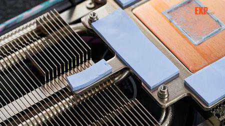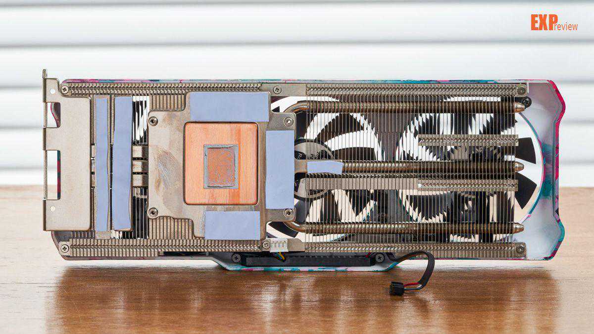 散热器做工非常的扎实,三根“冰脉复合热管”连接了前后两大区域的散热鳍片,鳍片是用回流焊和热管相连的,表面做工精细,摸上去没有割手的感觉,散热器用了铜底和GPU接触,可以更好的与GPU核心进行接触,提升散热效率,散热器上还有各种导热垫,可以为显存以及供电模块提供散热。