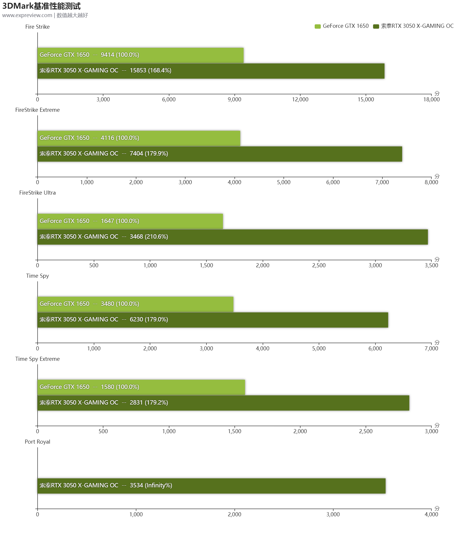 与此前定位相接近的GTX1650相比,索泰RTX3050X-GAMINGOC显卡的性能提升还是相当明显的,综合起来有83%的性能增幅,还支持实时光线追踪,提升幅度相当巨大了。