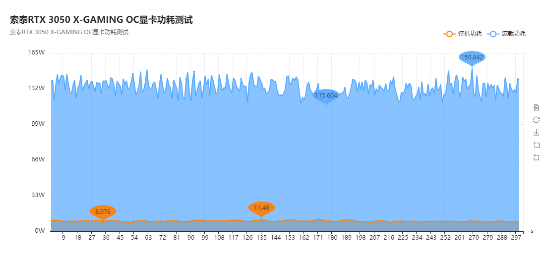 负载时索泰RTX3050X-GAMINGOC的平均功耗是133.3W,而峰值功耗150.3W,待机时的平均功耗则是9.4W,搭配电源的话,考虑到CPU等平台其他部件的功耗,建议550W的电源起步。