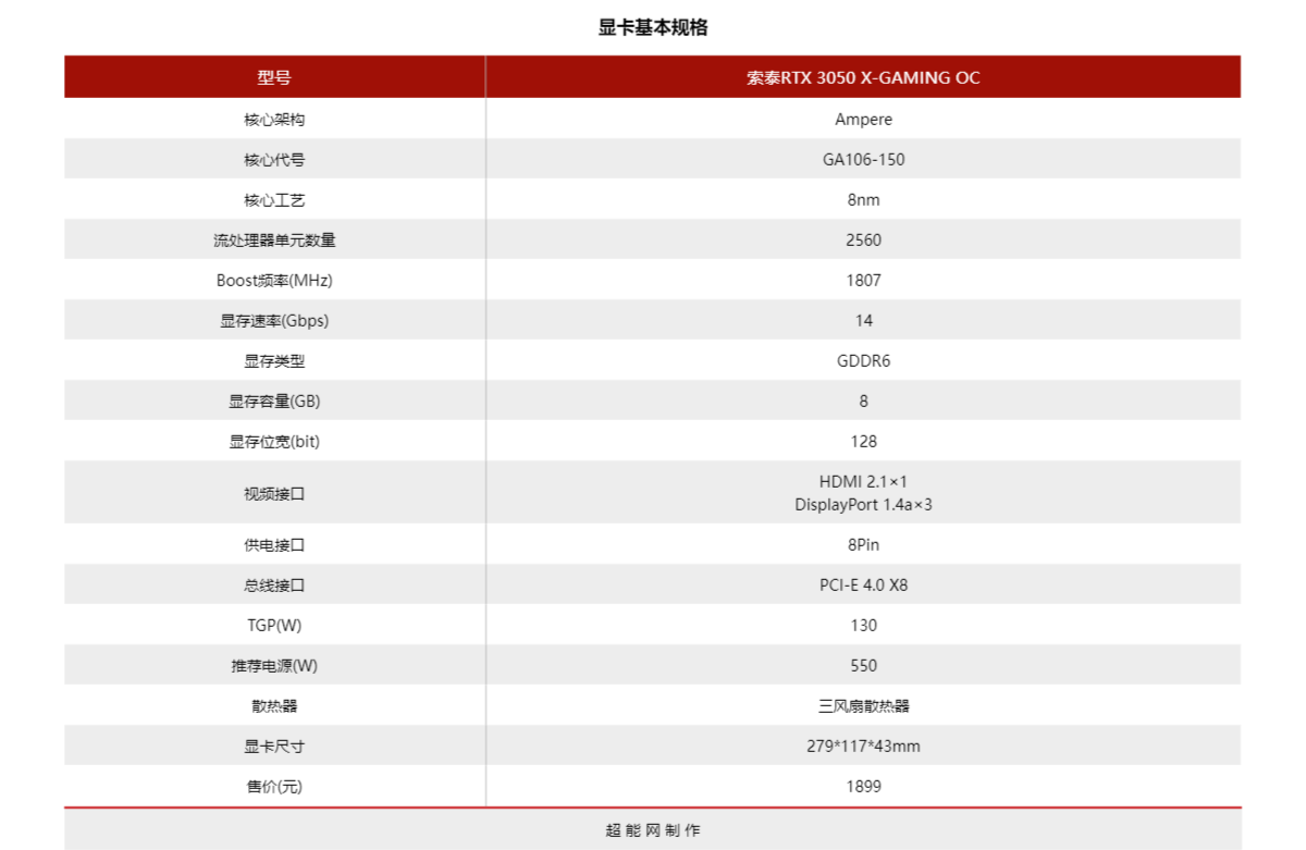我们今天要测试的就是索泰RTX3050X-GAMINGOC,它的规格可以参考下表: