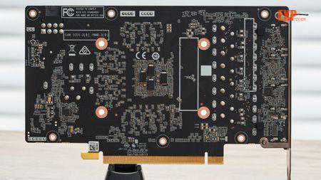 4相GPU核心供电位于PCB左侧,用的是安森美的DrMOS,型号是NCP302150,最大输出电流45A,1相显存供电位于PCB右侧,用的是大中sinopower的7342EK,供电PWM控制器位于PCB背部,型号是uP9512R。