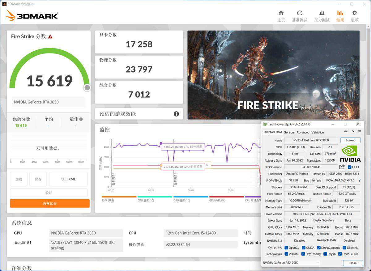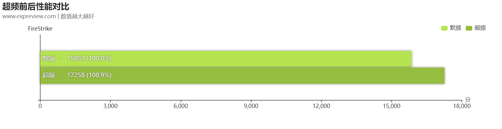 我们先对GPU本身进行超频测试,TPD和温度都提到上限值,风扇也调到全速,最终在显卡核心频率+230MHz,实际GPU运行的最高频率是2175MHz,但显存并不能超多少,等效数据只能到14.8Gbps,通过了3DMarkFirestrike测试,此时显卡得分为17258分,性能提升了8.8%,这卡的GPU超频能力是相当不错的,但显存就不太能超了。