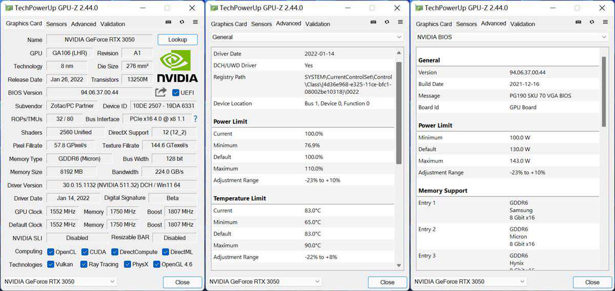 用GPU-Z查看得到,索泰RTX3050X-GAMINGOC显卡的GPU核心基础频率是1552MHz,Boost频率1807MHz,而公版的Boost频率是1777MHz,可见索泰这卡Boost频率是要比略高于公版的。