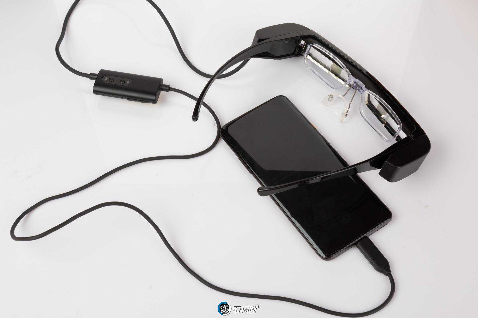 BT-30C智能眼镜通过Type-C数据线进行数据传输交换,把数据线接到手机上的Type-C上可以将手机上的画面实时传输到智能眼镜上,数据线上还有一个控制器,控制器里有一个3.5mm耳机接口,耳机可以直接连接到智能眼镜而不必经过手机。