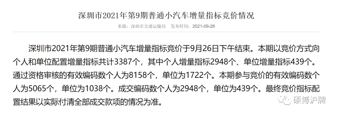 2021年9月深圳市第9期小汽车指标竞价结果为5065个人竞拍3387个指标,竞价中标率66.9%,最低价50000元整,均价52512元整;1038家单位竞拍439个指标,竞价中标率42.3%,最低价31000元整,均价38575元整。