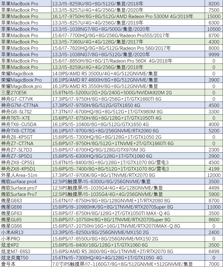 上周已售出机型:(无法列出成色,价格仅供参考)