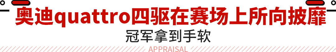 凭借着quattro四驱技术,奥迪曾经囊括6个国家的房车赛冠军,且由于配备了quattro的奥迪赛车实力过于强大,赛事主办方先是要求奥迪赛车增加负重,但负重后还是所向披靡。最终国际汽联(FIA)不得不出面宣布,停止quattro技术在拉力赛上使用。