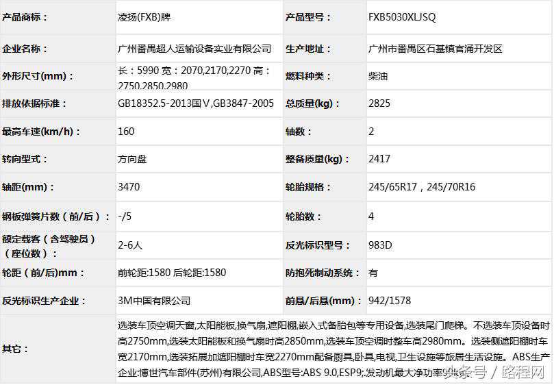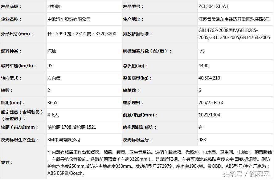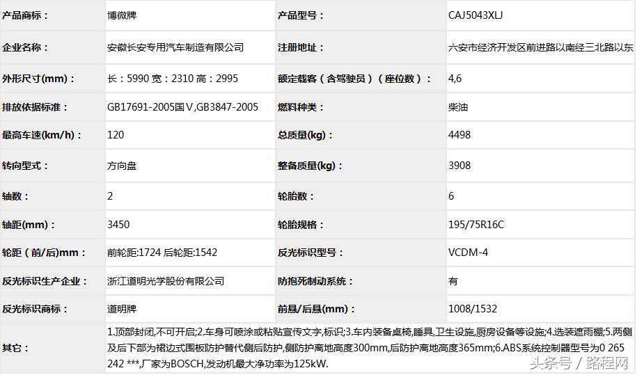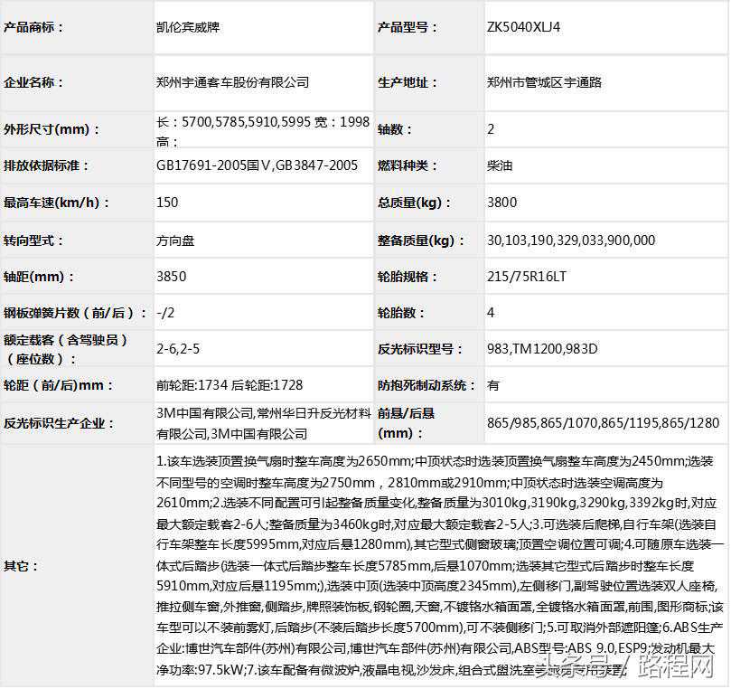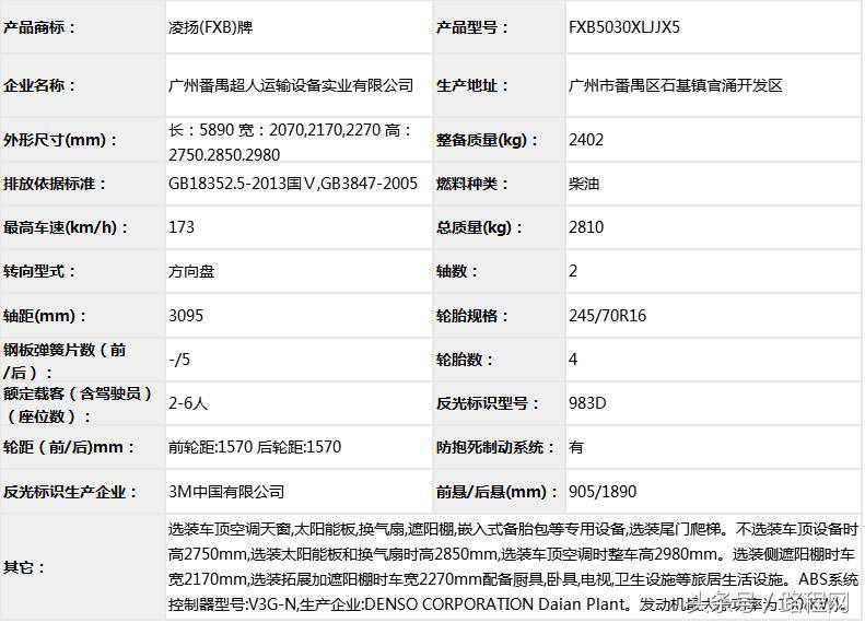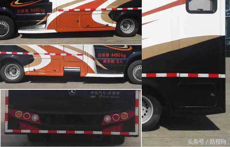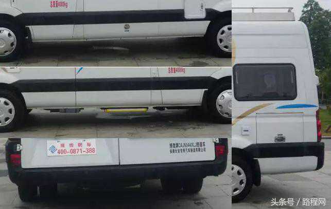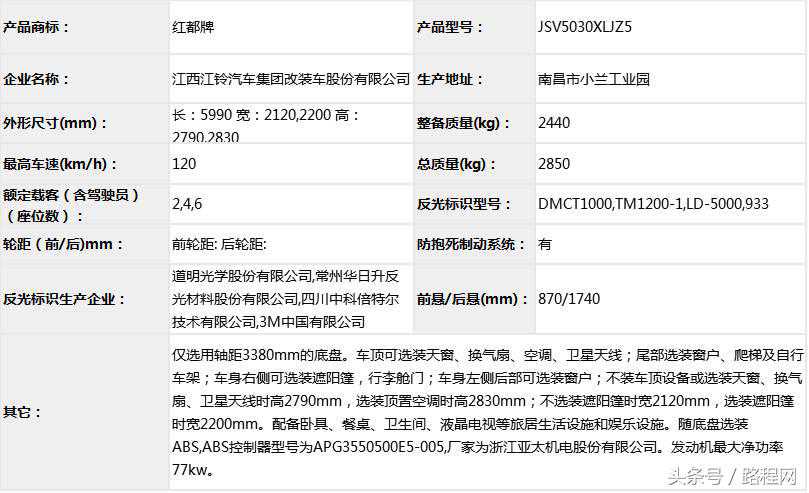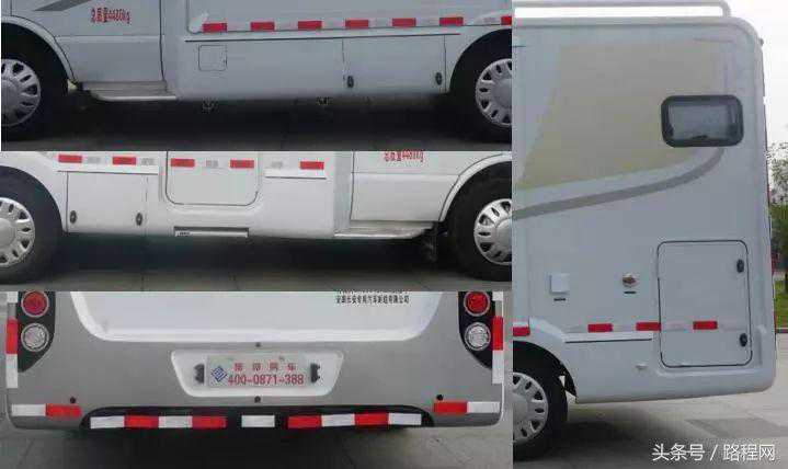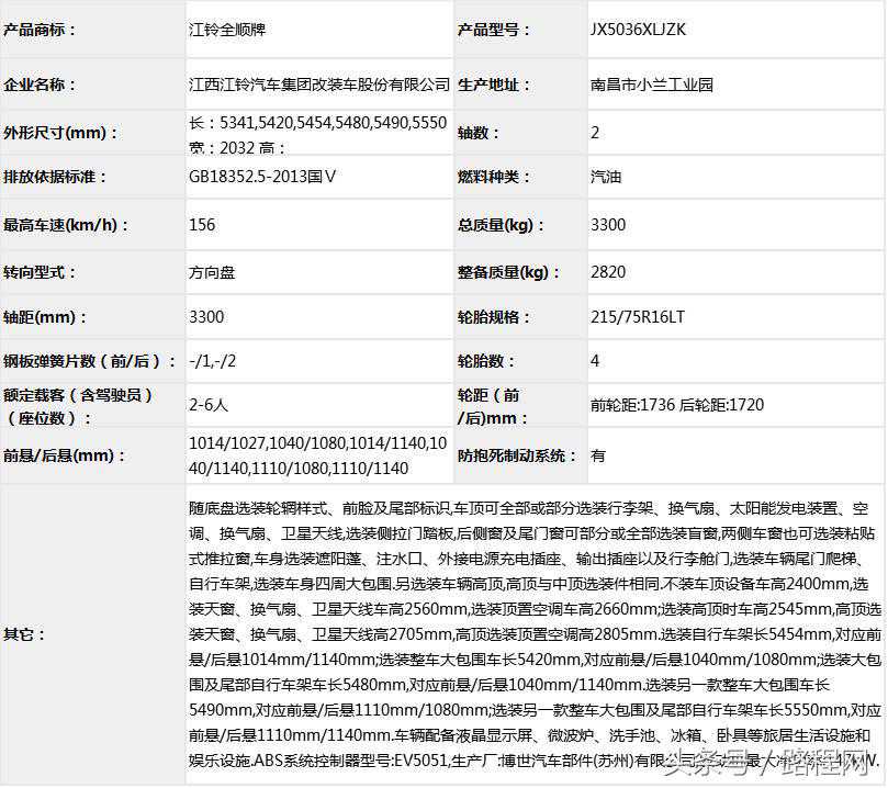 随底盘选装轮辋样式、前脸及尾部标识,车顶可全部或部分选装行李架、换气扇、太阳能发电装置、空调、换气扇、卫星天线,选装侧拉门踏板,后侧窗及尾门窗可部分或全部选装盲窗,两侧车窗也可选装粘贴式推拉窗,车身选装遮阳蓬、注水口、外接电源充电插座、输出插座以及行李舱门,选装车辆尾门爬梯、自行车架,选装车身四周大包围.另选装车辆高顶,高顶与中顶选装件相同.不装车顶设备车高2400mm,选装天窗、换气扇、卫星天线车高2560mm,选装顶置空调车高2660mm;选装高顶时车高2545mm,高顶选装天窗、换气扇、卫星天线高2705mm,高顶选装顶置空调高2805mm.选装自行车架长5454mm,对应前悬/后悬1014mm/1140mm;选装整车大包围车长5420mm,对应前悬/后悬1040mm/1080mm;选装大包围及尾部自行车架车长5480mm,对应前悬/后悬1040mm/1140mm.选装另一款整车大包围车长5490mm,对应前悬/后悬1110mm/1080mm;选装另一款整车大包围及尾部自行车架车长5550mm,对应前悬/后悬1110mm/1140mm.车辆配备液晶显示屏、微波炉、洗手池、冰箱、卧具等旅居生活设施和娱乐设施.ABS系统控制器型号:EV5051,生产厂:博世汽车部件(苏州)有限公司,发动机最大净功率:147kW.