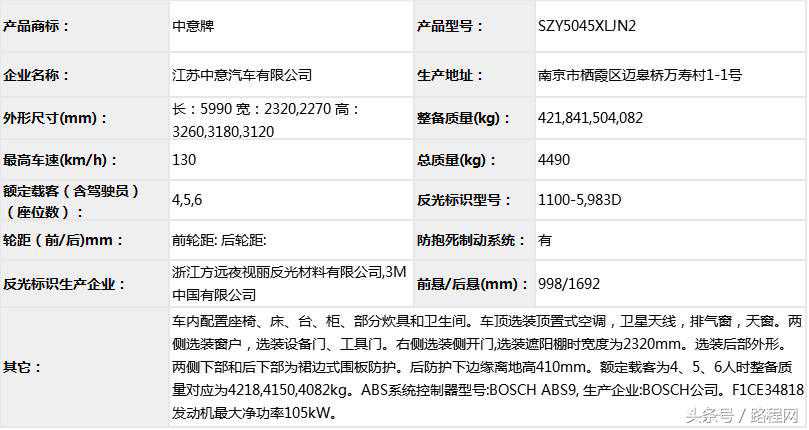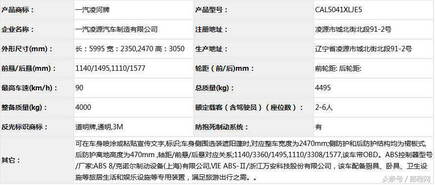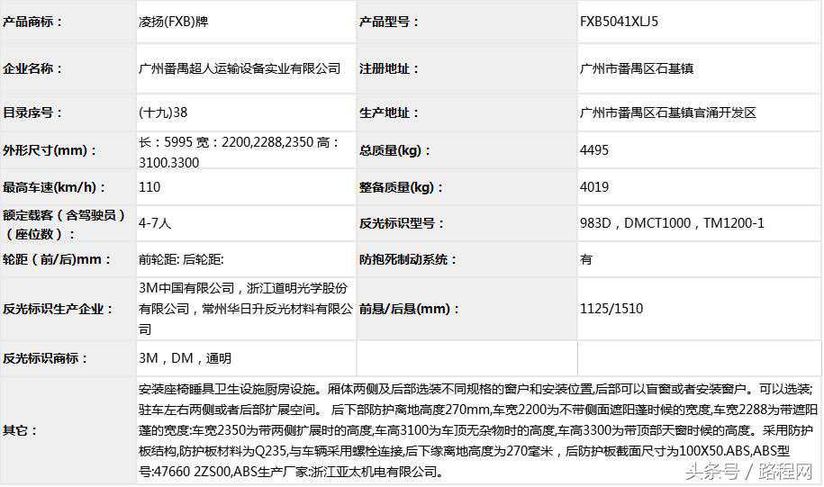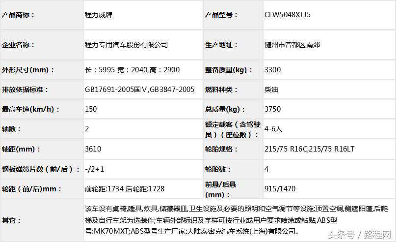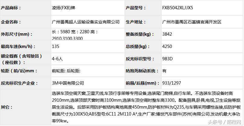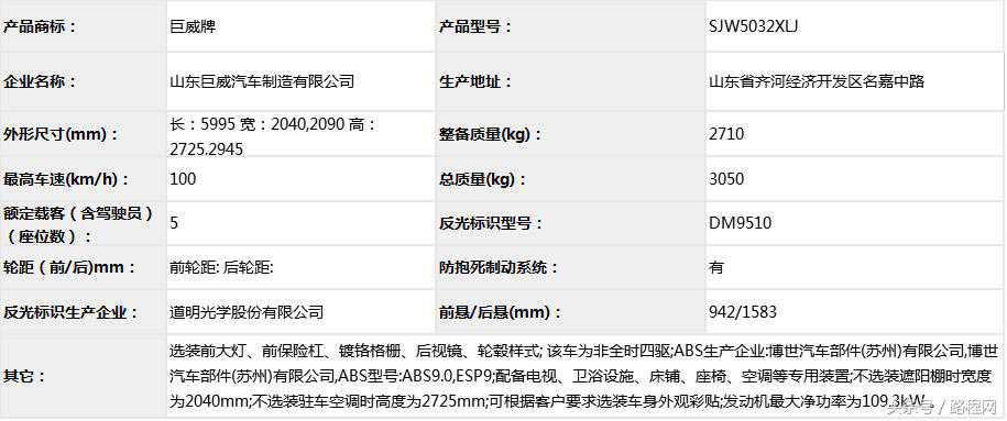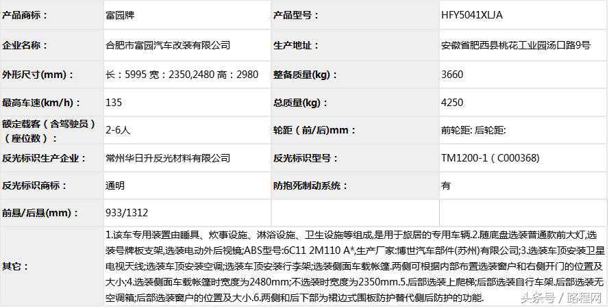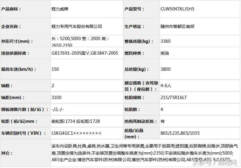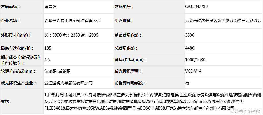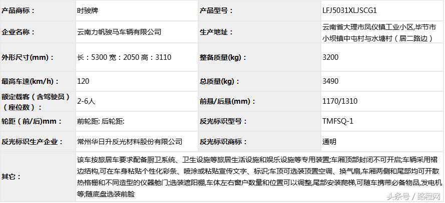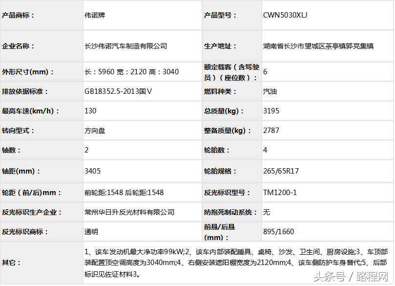 随底盘选装轮辋样式、前脸及尾部标识,车顶可全部或部分选装行李架、换气扇、太阳能发电装置、空调、换气扇、卫星天线,选装侧拉门踏板,后侧窗及尾门窗可部分或全部选装盲窗,两侧车窗也可选装粘贴式推拉窗,车身选装遮阳蓬、注水口、外接电源充电插座、输出插座以及行李舱门,选装车辆尾门爬梯、自行车架,选装车身四周大包围.另选装车辆高顶,高顶与中顶选装件相同.不装车顶设备车高2400mm,选装天窗、换气扇、卫星天线车高2560mm,选装顶置空调车高2660mm;选装高顶时车高2545mm,高顶选装天窗、换气扇、卫星天线高2705mm,高顶选装顶置空调高2805mm.选装自行车架长5454mm,对应前悬/后悬1014mm/1140mm;选装整车大包围车长5420mm,对应前悬/后悬1040mm/1080mm;选装大包围及尾部自行车架车长5480mm,对应前悬/后悬1040mm/1140mm.选装另一款整车大包围车长5490mm,对应前悬/后悬1110mm/1080mm;选装另一款整车大包围及尾部自行车架车长5550mm,对应前悬/后悬1110mm/1140mm.车辆配备液晶显示屏、微波炉、洗手池、冰箱、卧具等旅居生活设施和娱乐设施.ABS系统控制器型号:EV5051,生产厂:博世汽车部件(苏州)有限公司,发动机最大净功率:147kW.