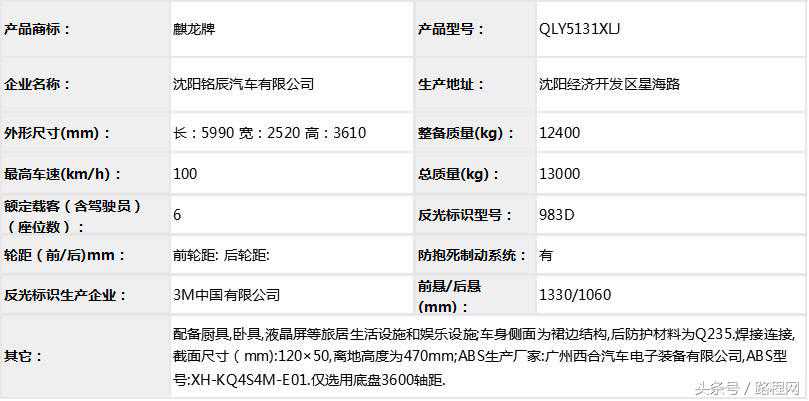 仅选用轴距3380mm的底盘。车顶可选装天窗、换气扇、空调、卫星天线;尾部选装窗户、爬梯及自行车架;车身右侧可选装遮阳篷,行李舱门;车身左侧后部可选装窗户;不装车顶设备或选装天窗、换气扇、卫星天线时高2790mm,选装顶置空调时高2830mm;不选装遮阳篷时宽2120mm,选装遮阳篷时宽2200mm。配备卧具、餐桌、卫生间、液晶电视等旅居生活设施和娱乐设施。随底盘选装ABS,ABS控制器型号为APG3550500E5-005,厂家为浙江亚太机电股份有限公司。发动机最大净功率77kw。