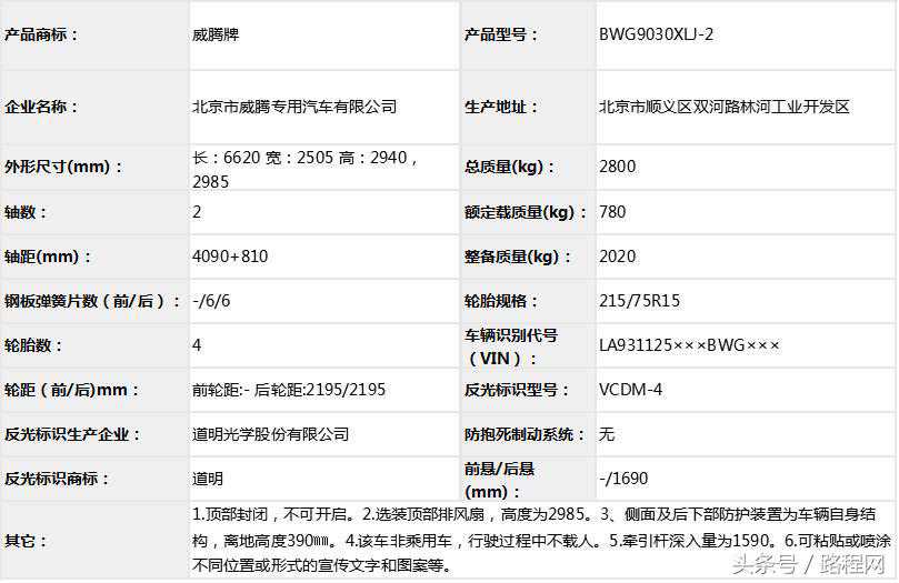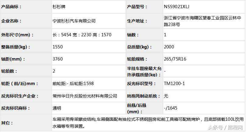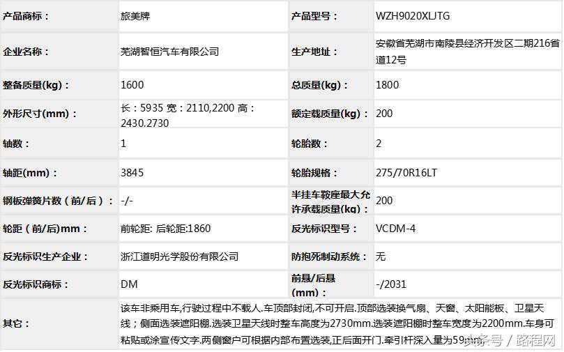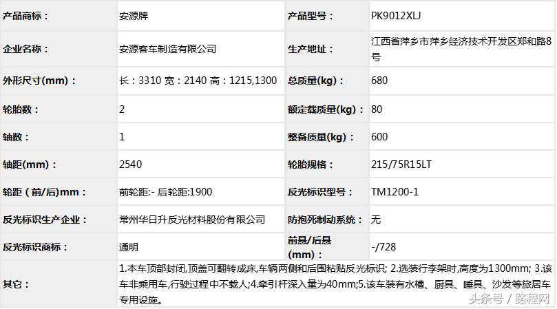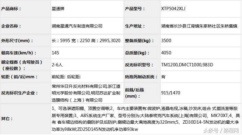 1、可选装遮阳棚、顶置空调等;2、车内主要装置有:微波炉,液晶电视,冰箱,沙发床,组合式盥洗室等旅居专用装置;3、ABS系统生产厂家、型号分别为:大陆泰密克汽车系统(上海)有限公司、MK70XT,4、具有客车裙边结构的侧防护及后防护,侧裙边最大离地高度为320mm;5、ZD30D14-5N发动机的最大净功率为98kW;ZD25D145N发动机净功率93kw