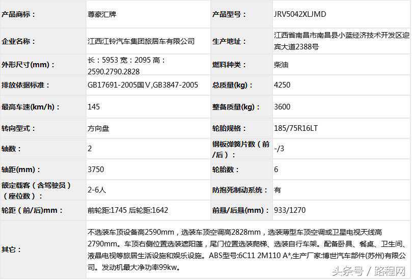 不选装车顶设备高2590mm,选装车顶空调高2840mm,选装薄型车顶空调或卫星电视天线高2790mm,选装车顶行李架、车顶换气扇,选装车顶太阳能板、尾门位置爬梯。不选装左右侧设备宽2000mm,选装左右侧一体式上车踏板或车身大包围宽2040mm。不选装设备车长5780mm,选装车尾自行车架长5890mm,选装车身装饰大包围车长5910mm,选装车尾自行车架及车身装饰大包围车长5980mm,选装遮阳蓬。配备厨具、卧具、液晶屏等旅居生活设施和娱乐设施等专用装置。选装的ABS系统生产厂家、型号分别为博世汽车部件(苏州)有限公司、6C112M110A*。发动机最大净功率为99kw。