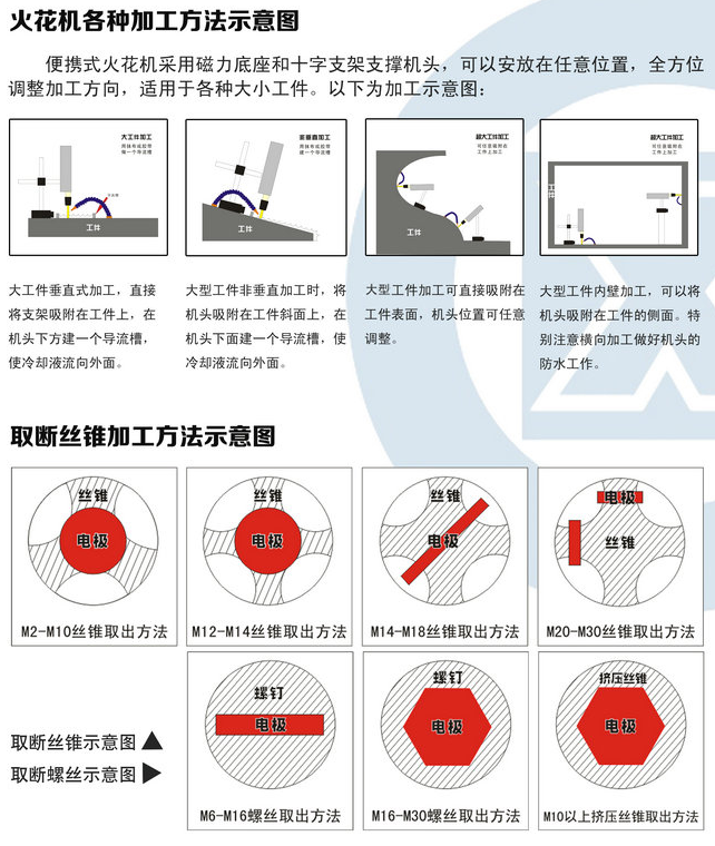 13.电火花设备,现在有一种用电加工原理设计制造的便携式工具机,能轻松快速将断螺丝、断丝锥钻头取出。