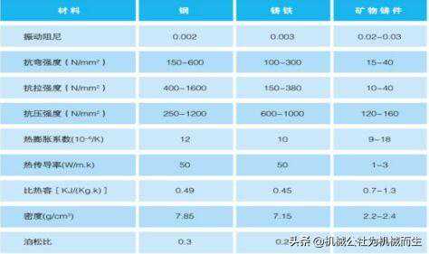 ◆耐腐蚀性由于矿物铸件的主要原料为天然花岗岩碎料,其成分为二氧化硅和改性高性能热固性环氧树脂混合、硬化后对一般含有酸性、碱性的切削液、冷却液有极强的耐腐蚀性。这样就可以直接在机台中预留用于贮藏液体的型腔。这样省掉了水箱或油箱,大大提高了生产效率和经济效益。◆绝缘性由于矿物铸件中的粘结剂与填料均为非金属物质,也就让它具有天生的绝缘性。例如在潜艇的AIP系统(不依赖空气推进系统)中也大量使用了矿物铸件的零件,极大地增强了潜艇的隐蔽性。◆快速交付矿物铸件毛坯固化时间为8小时,脱模清理后再次以40°的温度保温24小时即可安排精加工,基本可以做到1件/天,这样1套金属模具的生产效率可以达到30件/月,用户可以根据自己的采购订单来制定开金属模具的数量,保证机床能够及时的交付整机厂。◆矿物铸件的力学性能矿物铸件复合材料是一种新型材料,与铸铁。钢材料相比,有许多其他材料达不到的特性,综合三种材料各种性能